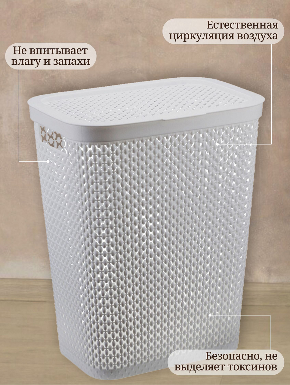 - Корзина изготавливается из прочного и долговечного полипропилена, отвечающего требованиям влажного помещения.