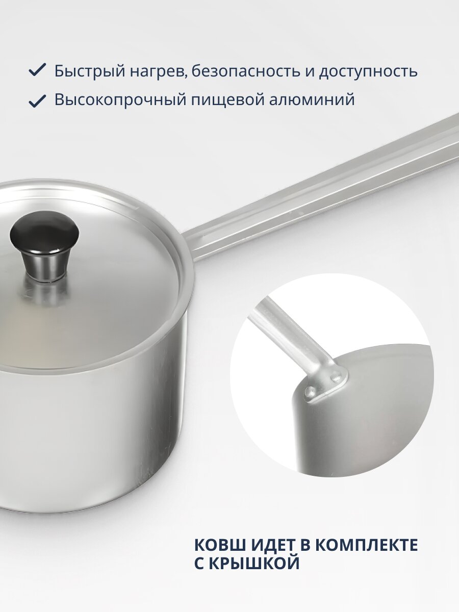 Ковш с крышкой Scovo Демидово 0.5 л предназначен для самых разнообразных целей. При помощи удобного алюминиевого изделия, превосходно проводящего тепло, вы сможете моментально разогреть жидкие блюда. Кроме того, прочная модель среднего объёма отлично подходит для готовки.