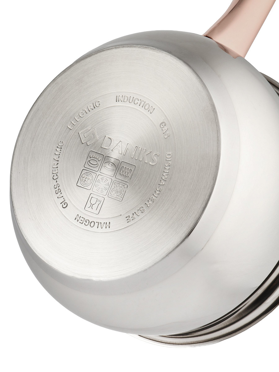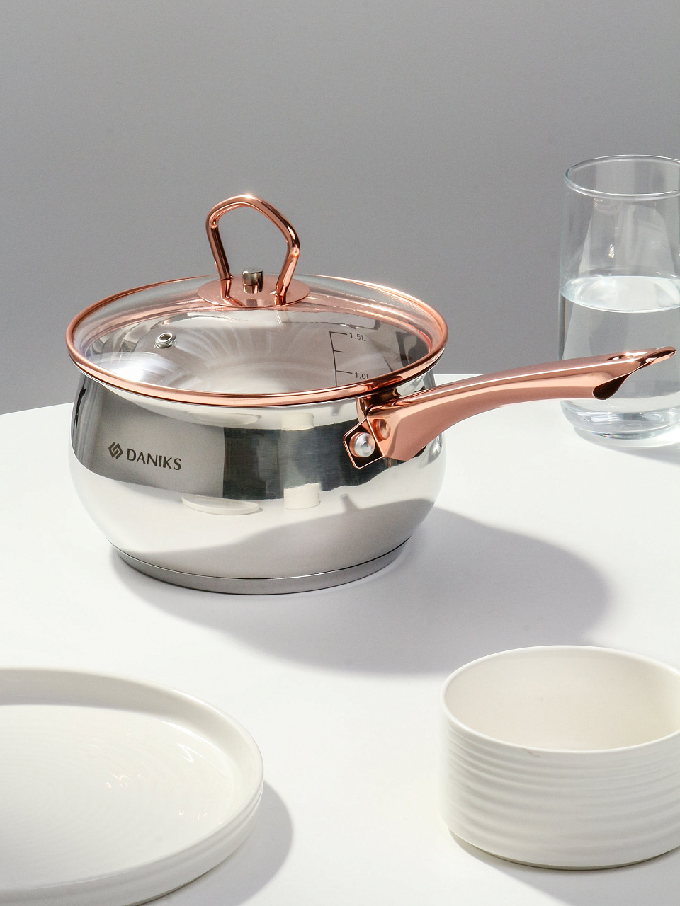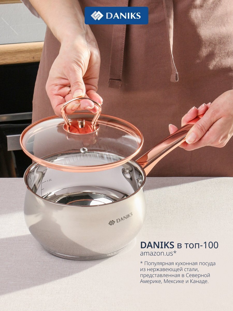 Ковш Daniks Карлин 1.8 л из нержавеющей стали с мерной шкалой и стеклянной крышкой: универсальный выбор для индукционных и других плит, идеален для дома и дачи.