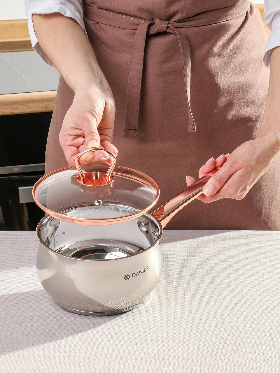 Объем 1,8 л оптимален для приготовления каш, соусов, подогрева молока или воды. Мерная шкала помогает точно отмерять ингредиенты, а стеклянная крышка — контролировать процесс готовки.