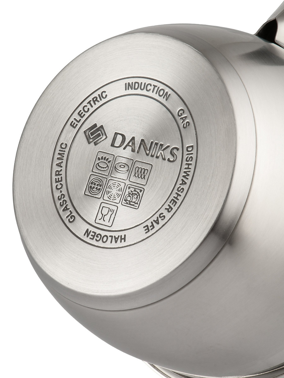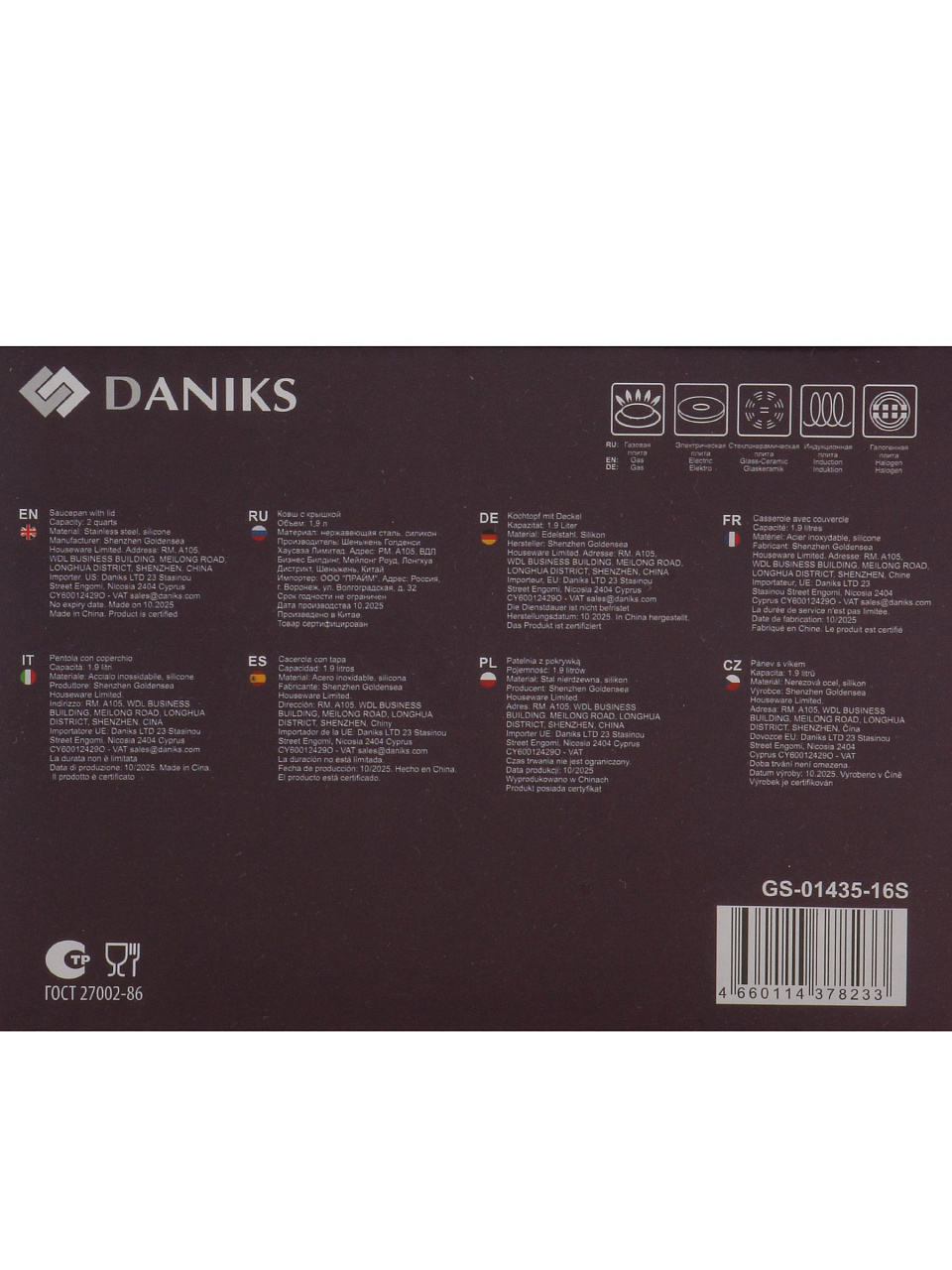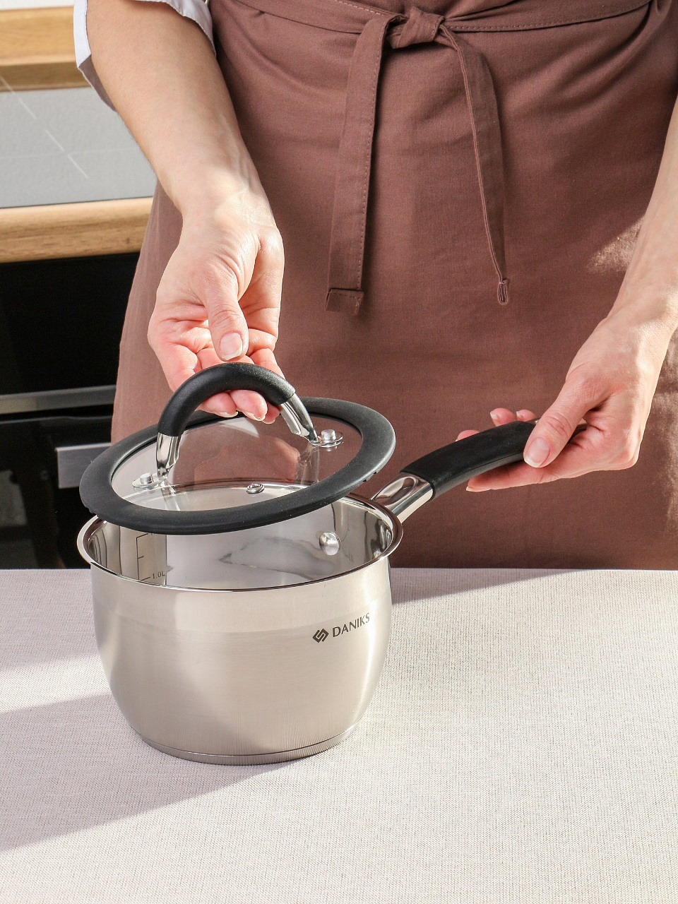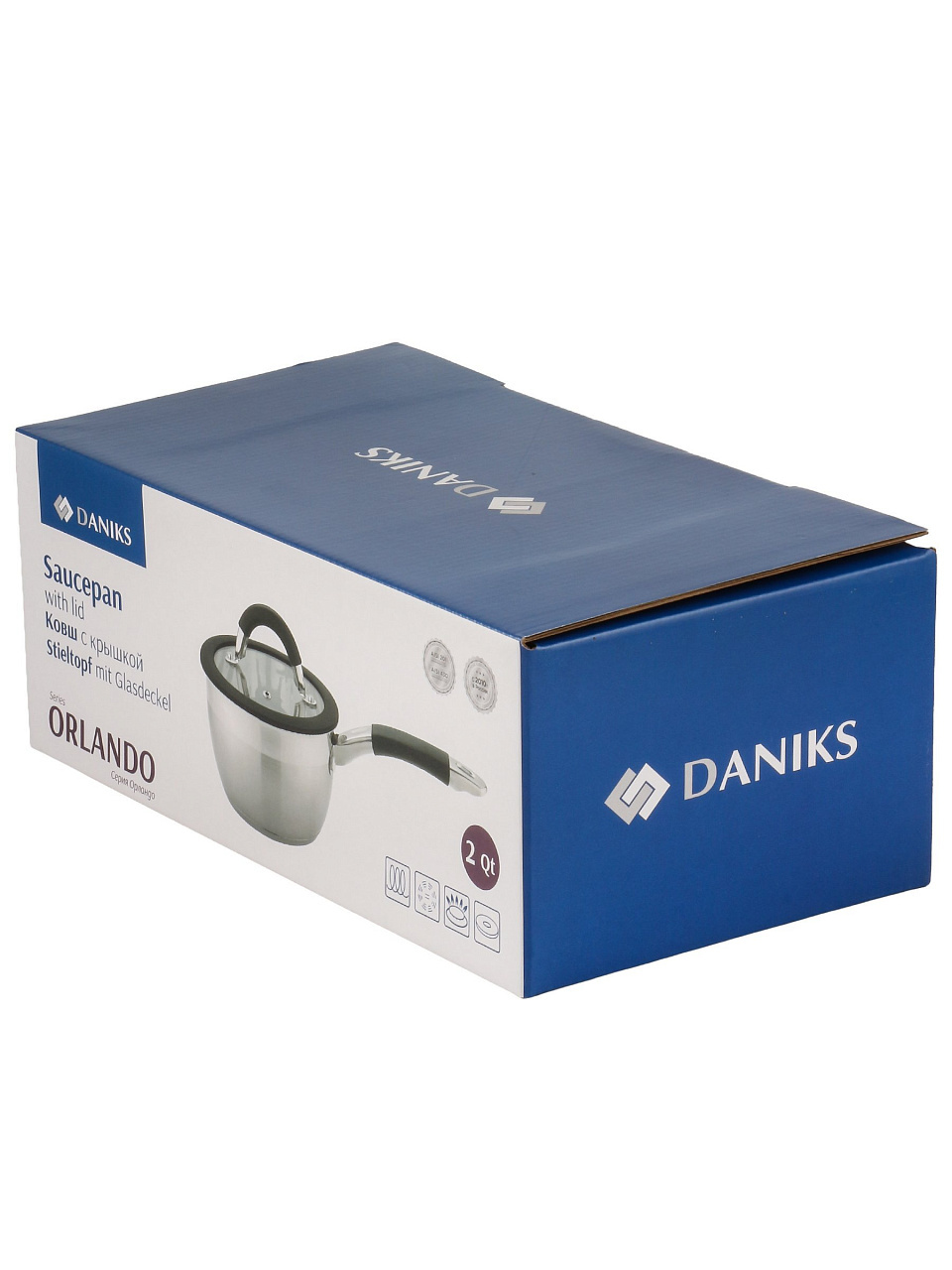 Ковш Daniks Орландо 1.9 л: стальная надежность, стеклянная крышка и силиконовая ручка для безопасной готовки на всех типах плит — идеален для дома и дачи.