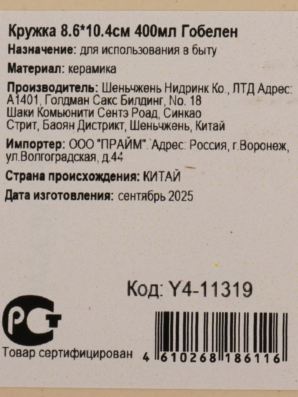 Кружка керамика, 400 мл, Гобелен, 8.6Х10.4 см, Y4-11319, в ассортименте