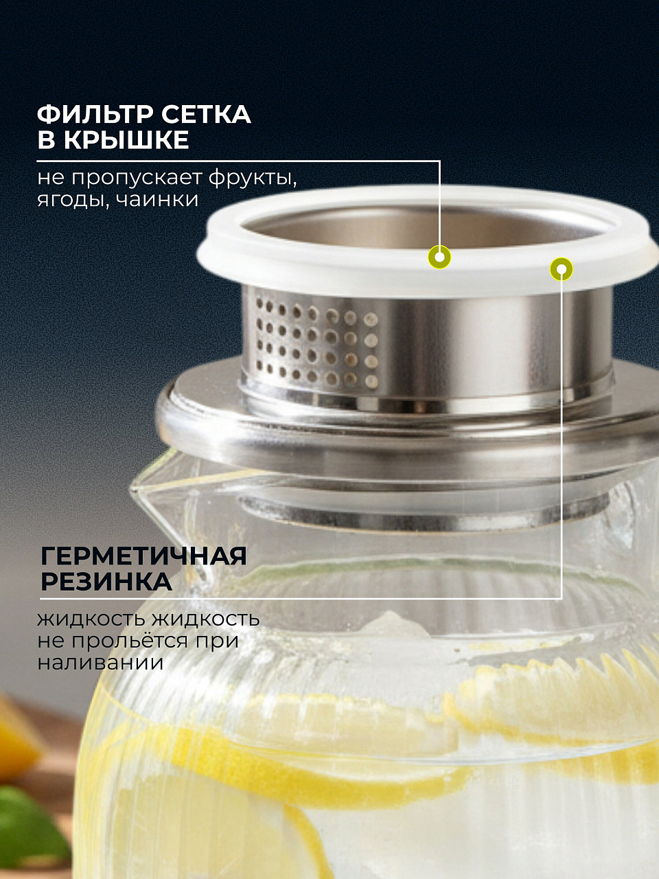 Фильтр-крышка удерживает лед, фрукты, листья чая — напитки получаются чистыми, удобно наливать даже детям. Уход прост: легко моется вручную и в посудомоечной машине.