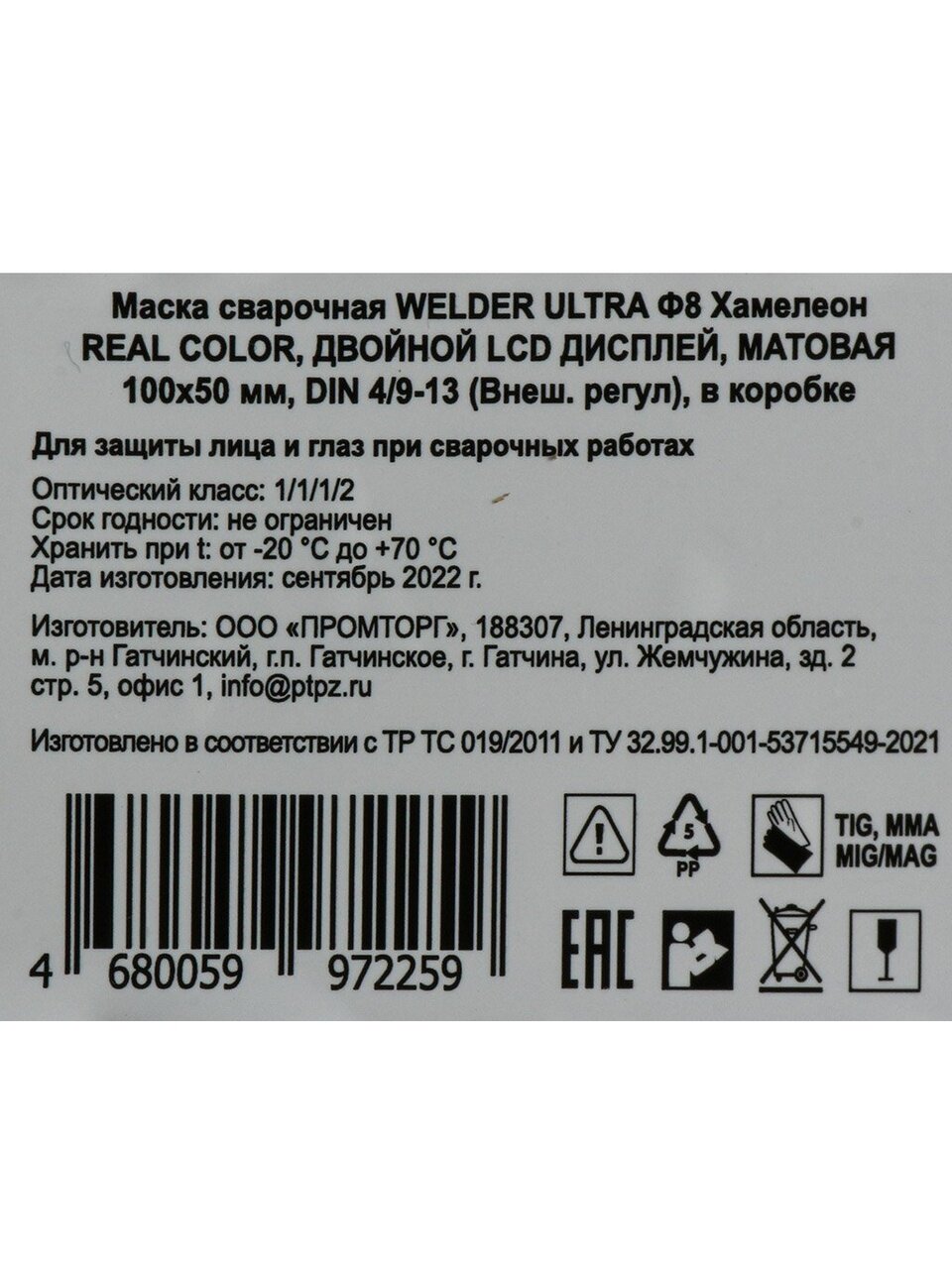 Смотровое окно — 100х50 мм, материал — ударопрочный полипропилен. Это обеспечивает широкий обзор и дополнительную защиту при любых видах сварочных работ.