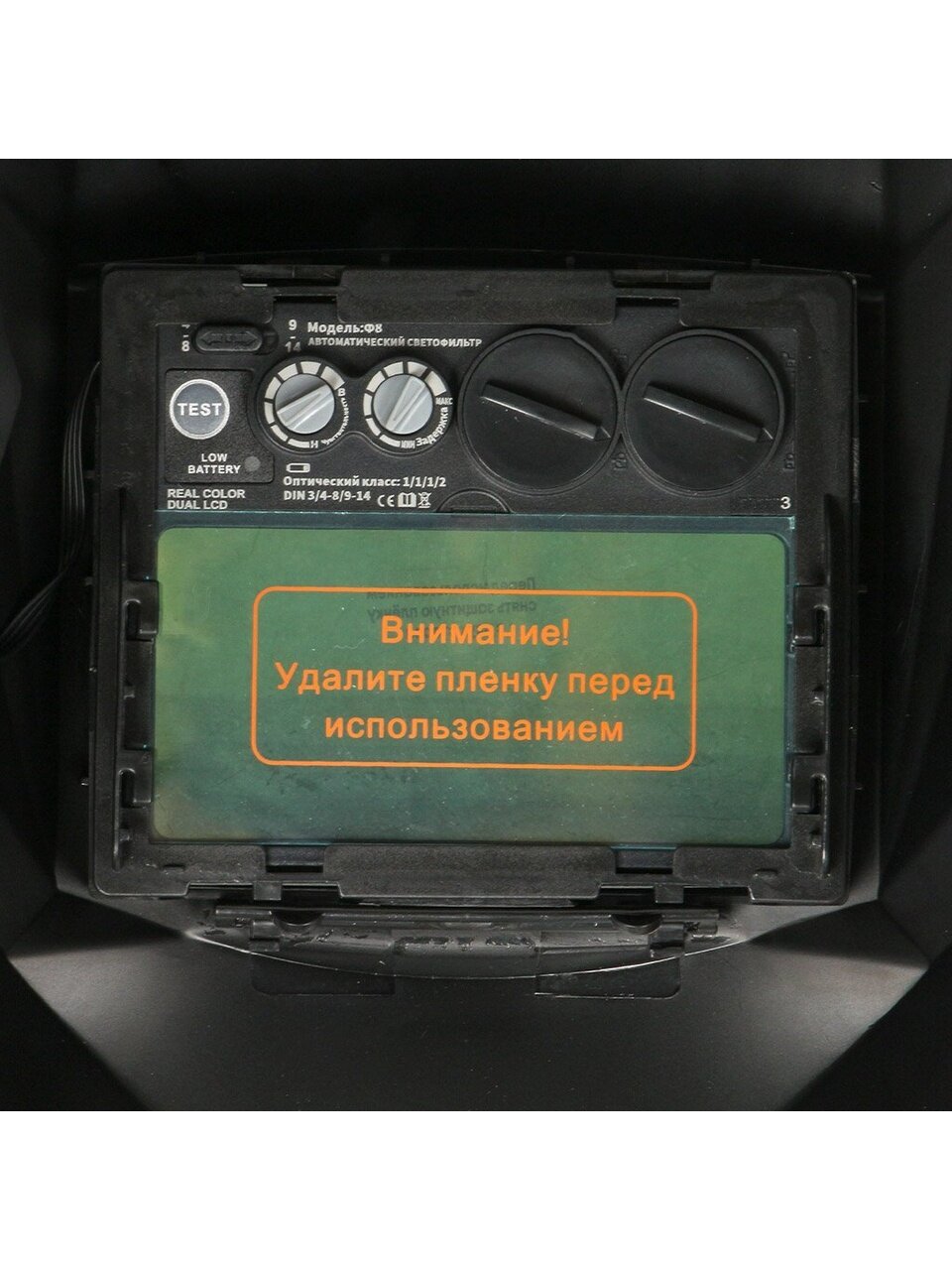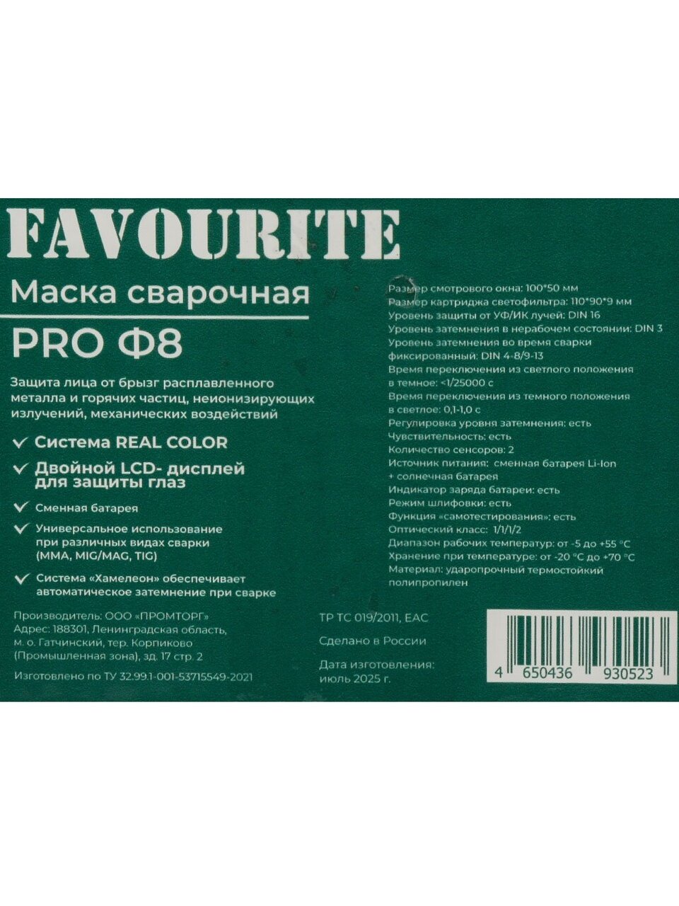 Маска сварочная автозатемнение Favourite Хамелеон PRO Ф8: защита глаз 24/7, точная настройка затемнения 3/4-8/9-13 DIN, ударопрочный корпус — для уверенной работы на любом объекте.