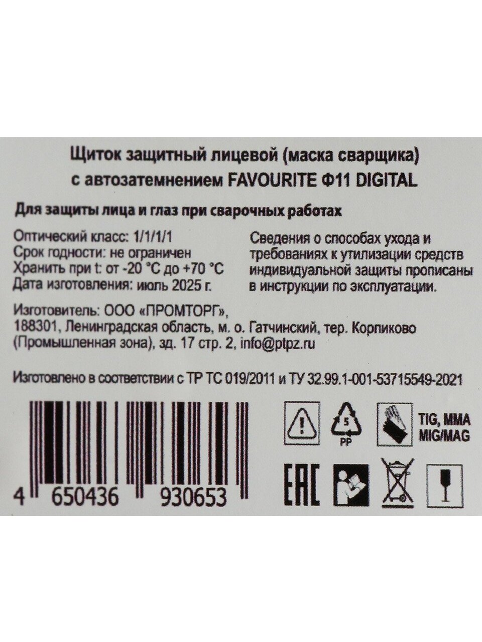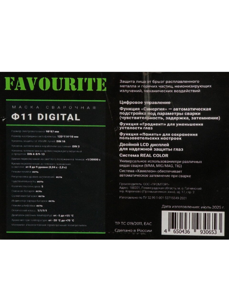 Вы можете приобрести «Маска сварочная автозатемнение, Favourite, Хамелеон, 3/4-8/9-13 DIN, полипропилен, 98х87 мм, индивидуальная коробка, 125110811, Ф11 Digital» и другие товары в нашем интернет-магазине в Ельце по низким ценам и с бесплатным самовывозом.