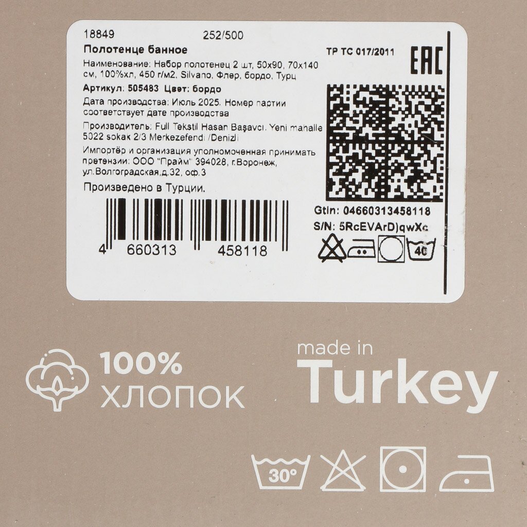 В наборе используются полотенца из 100% хлопка с плотностью 450 г/м² — это оптимально для мягкости и долговечности.