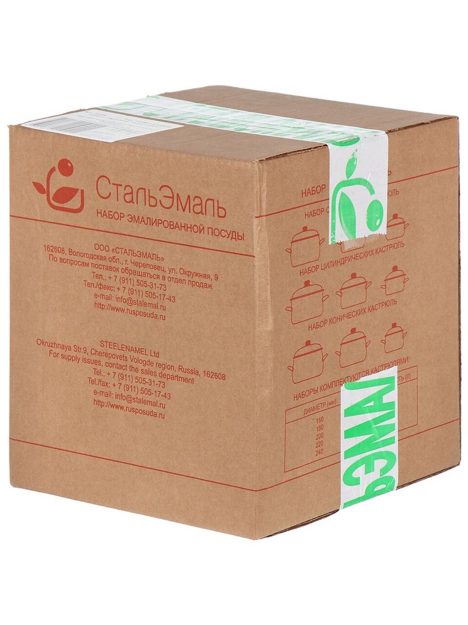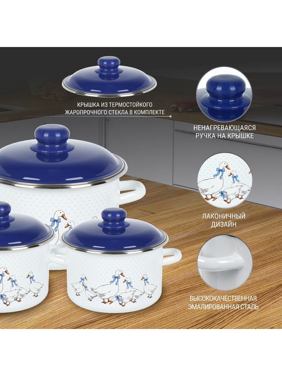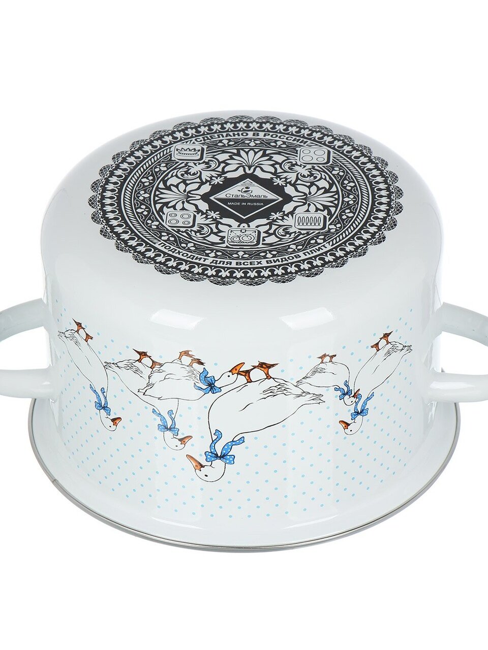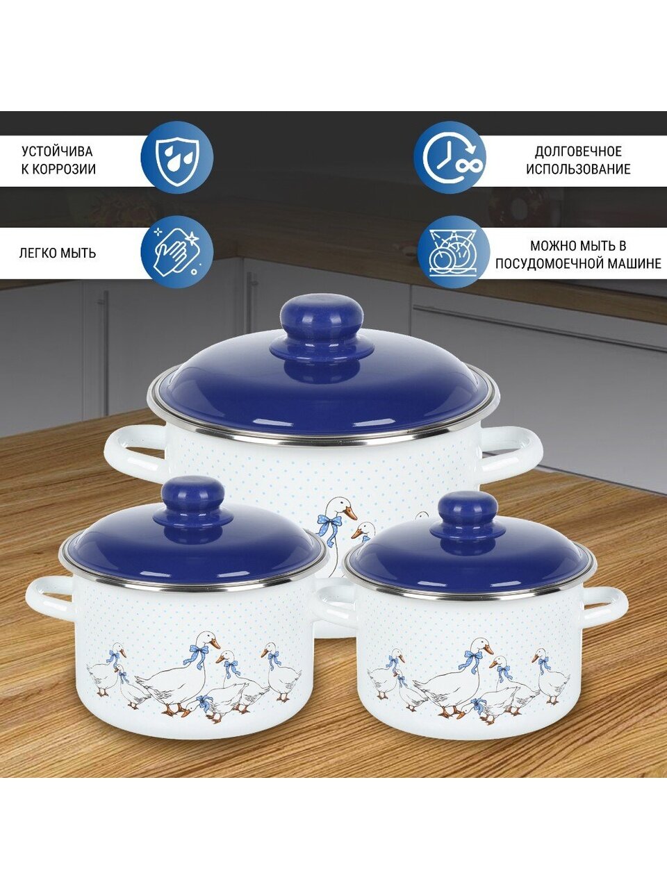 В наборе три кастрюли объёмом 2, 3 и 5,5 литра, каждая с отдельной крышкой. Материал — эмалированная сталь, цвет белый, бренд СтальЭмаль, серия «Гуси», артикул 6KB191M.