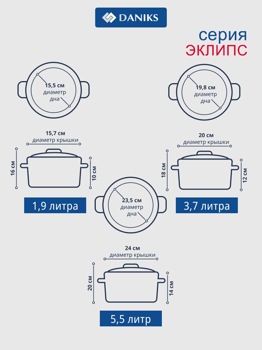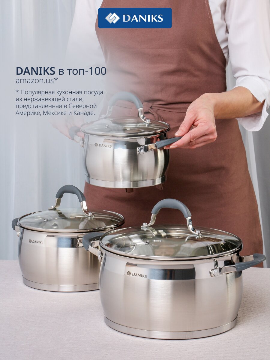 Набор кастрюль Daniks Eclipse — это практичный комплект из нержавеющей стали, который легко купить недорого для дачи или дома. Благодаря трём объёмам (1.9, 3.7, 5.5 л) кастрюли подходят для приготовления супов, гарниров, варки компотов и заготовок. Стеклянные крышки позволяют контролировать процесс, а прочный корпус устойчив к коррозии и сохраняет тепло.