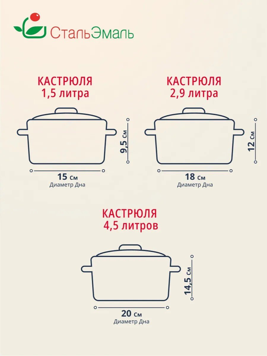 - Оптимальные размеры: 1,5/2,9/4,5 л, прочная эмалированная сталь, срок службы до 24 месяцев гарантии