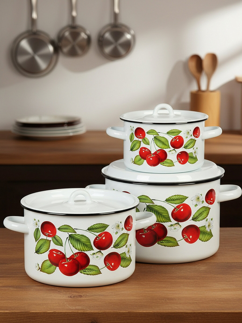 Набор кастрюль из эмалированной стали «Вишня ягоды», 3 предмета: для индукции, газовых плит и дачи. Удобно готовить, легко мыть, выгодно купить!
