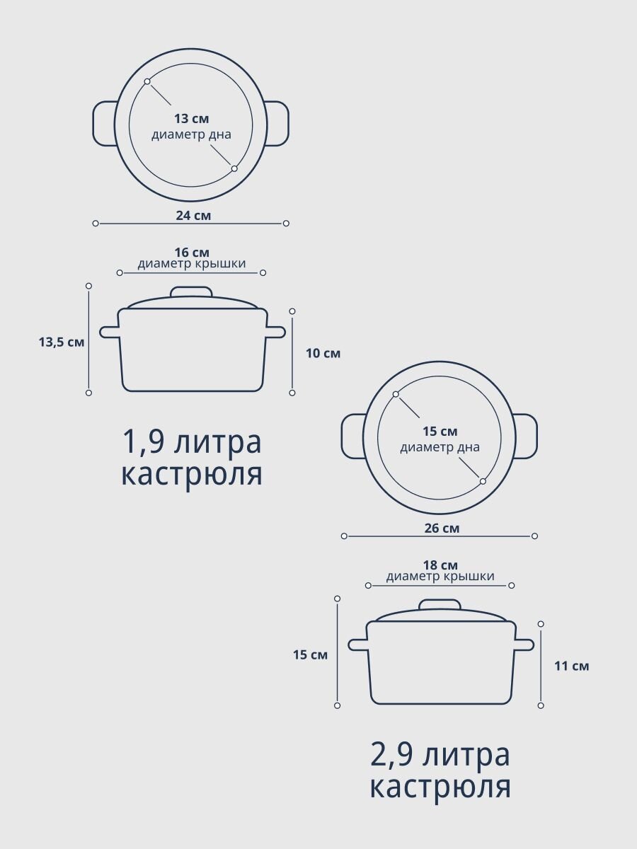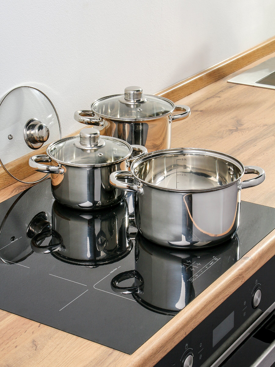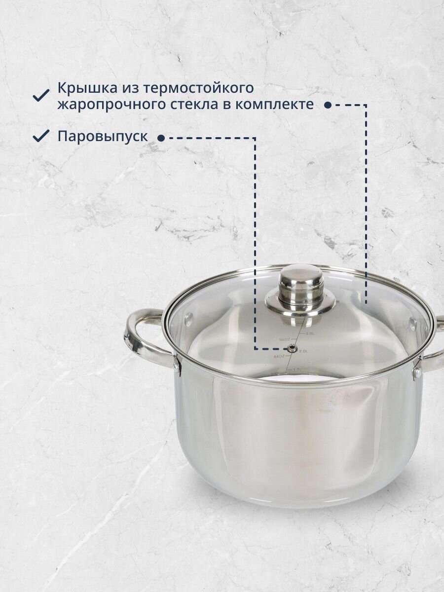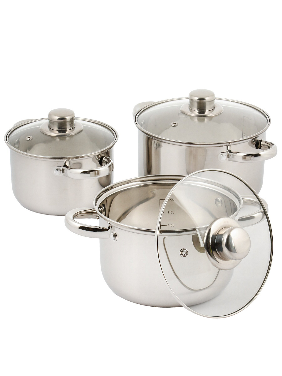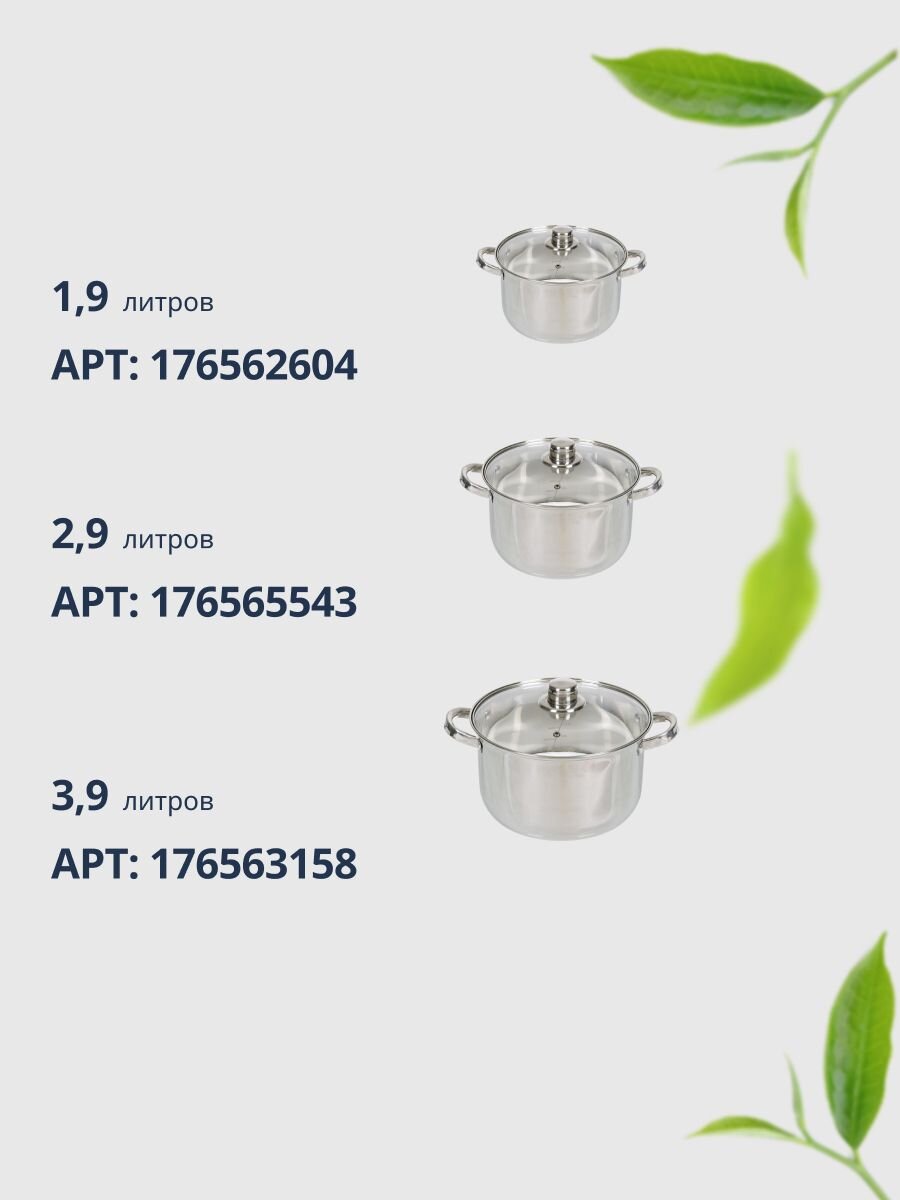 В комплекте три кастрюли объемом 1.9, 2.9 и 3.9 литра, каждая с отдельной стеклянной крышкой.