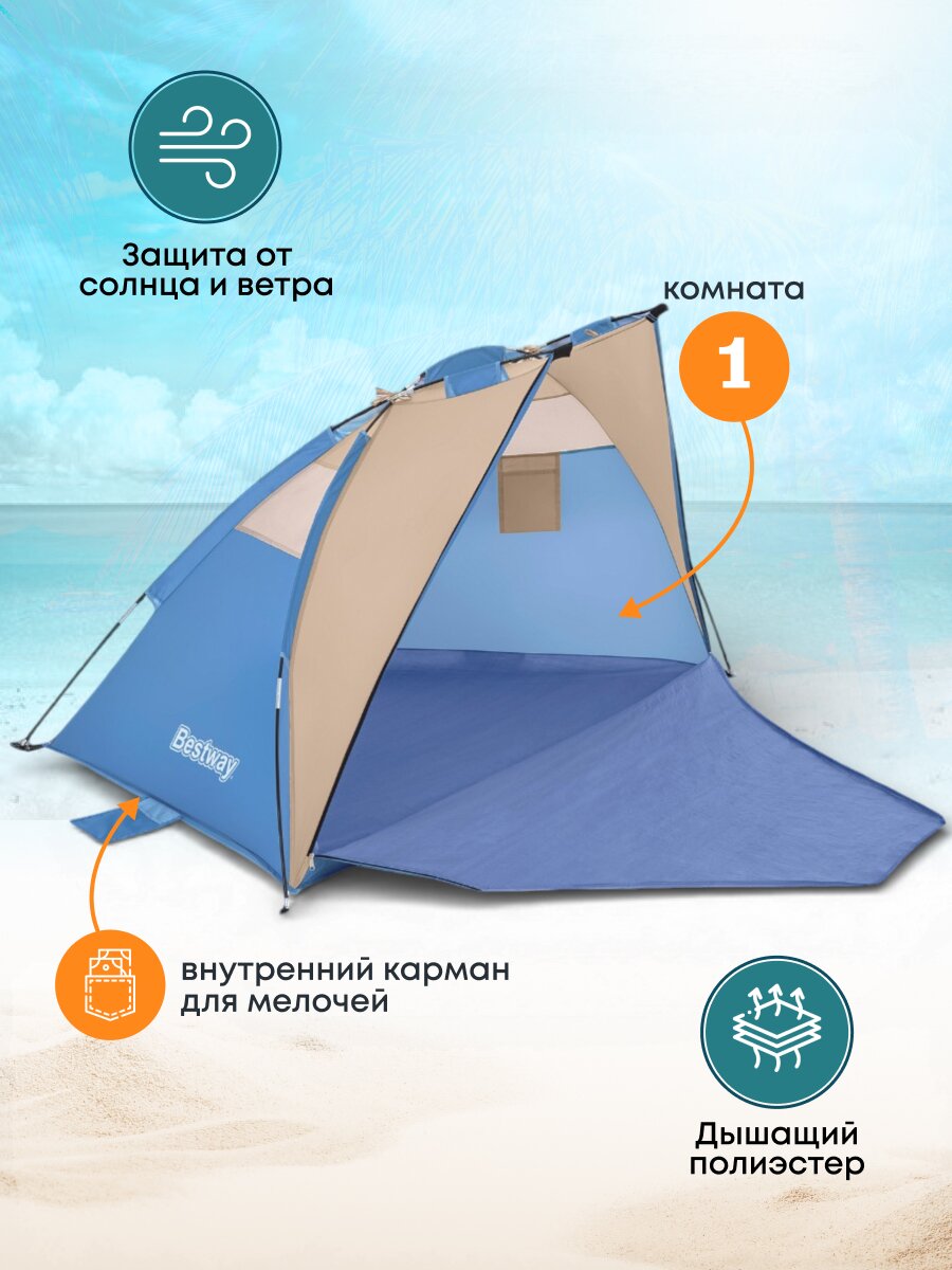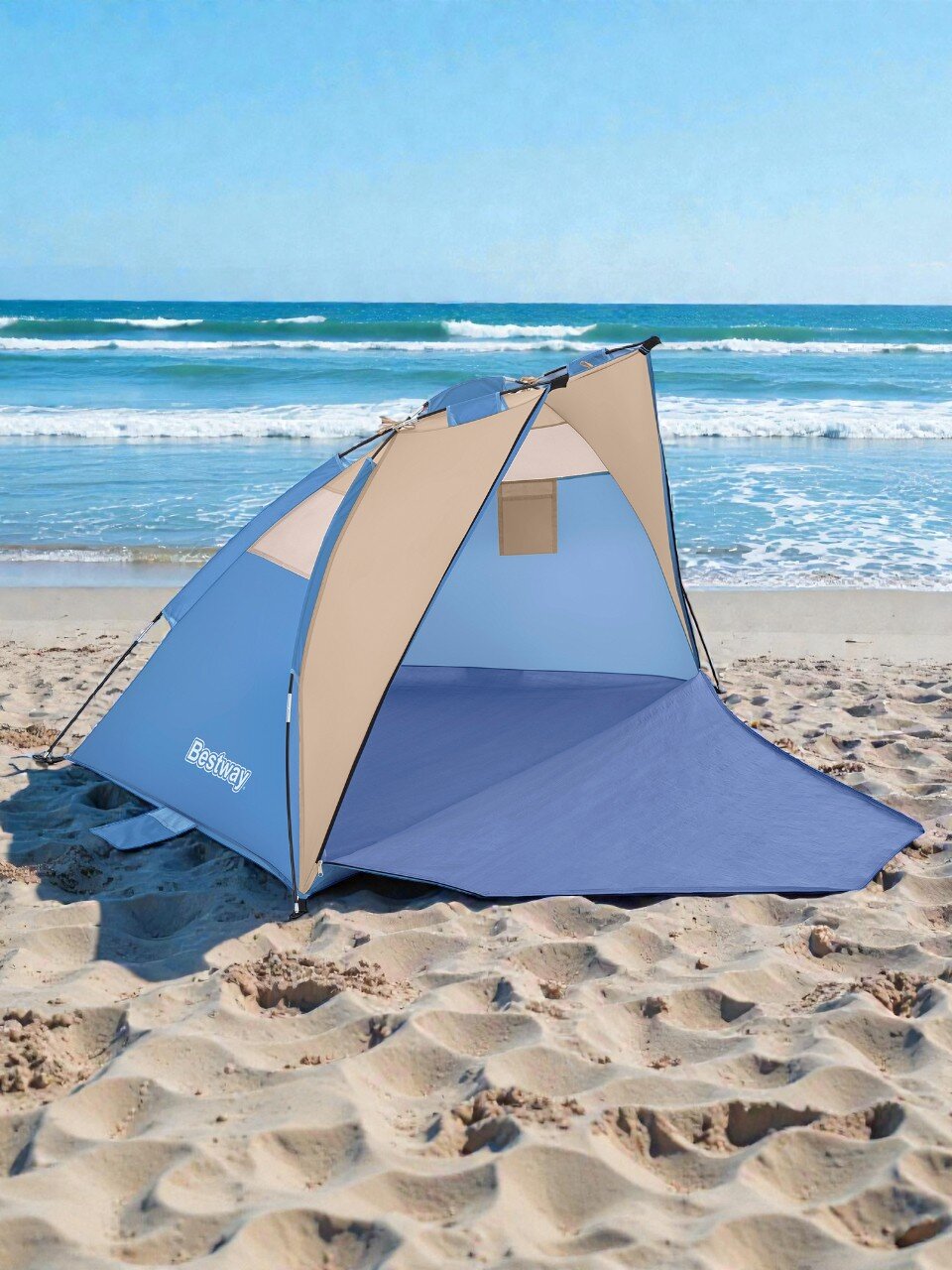 Отпуск на побережье – это прекрасно. С помощью пляжной палатки можно создать уютную индивидуальную зону на пляже, укрыться от небольшого дождя или палящего солнца, защититься от насекомых. С этими задачами отлично справится палатка Bestway Ramble. В ней могут комфортно разместиться два взрослых человека. Изделие легко собирается и разбирается. В комплект поставки входят палатка и сумка для переноски.