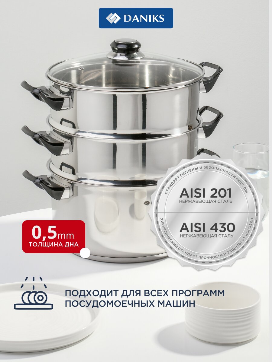 Часто спрашивают, чем отличается мантоварка из нержавейки от эмалированных и алюминиевых аналогов. Нержавеющая сталь устойчива к коррозии, не впитывает запахи и не окисляется, что продлевает срок службы изделия. Объём 5.5 литра и диаметр 24 см оптимальны для большинства стандартных плит: газовых, электрических, галогеновых (не подходит для индукции). Как использовать мантоварку Daniks? Просто налейте воду в нижнюю секцию, выложите продукты по ярусам и закройте крышкой — за 30–40 минут получите сочные манты или овощи на пару.