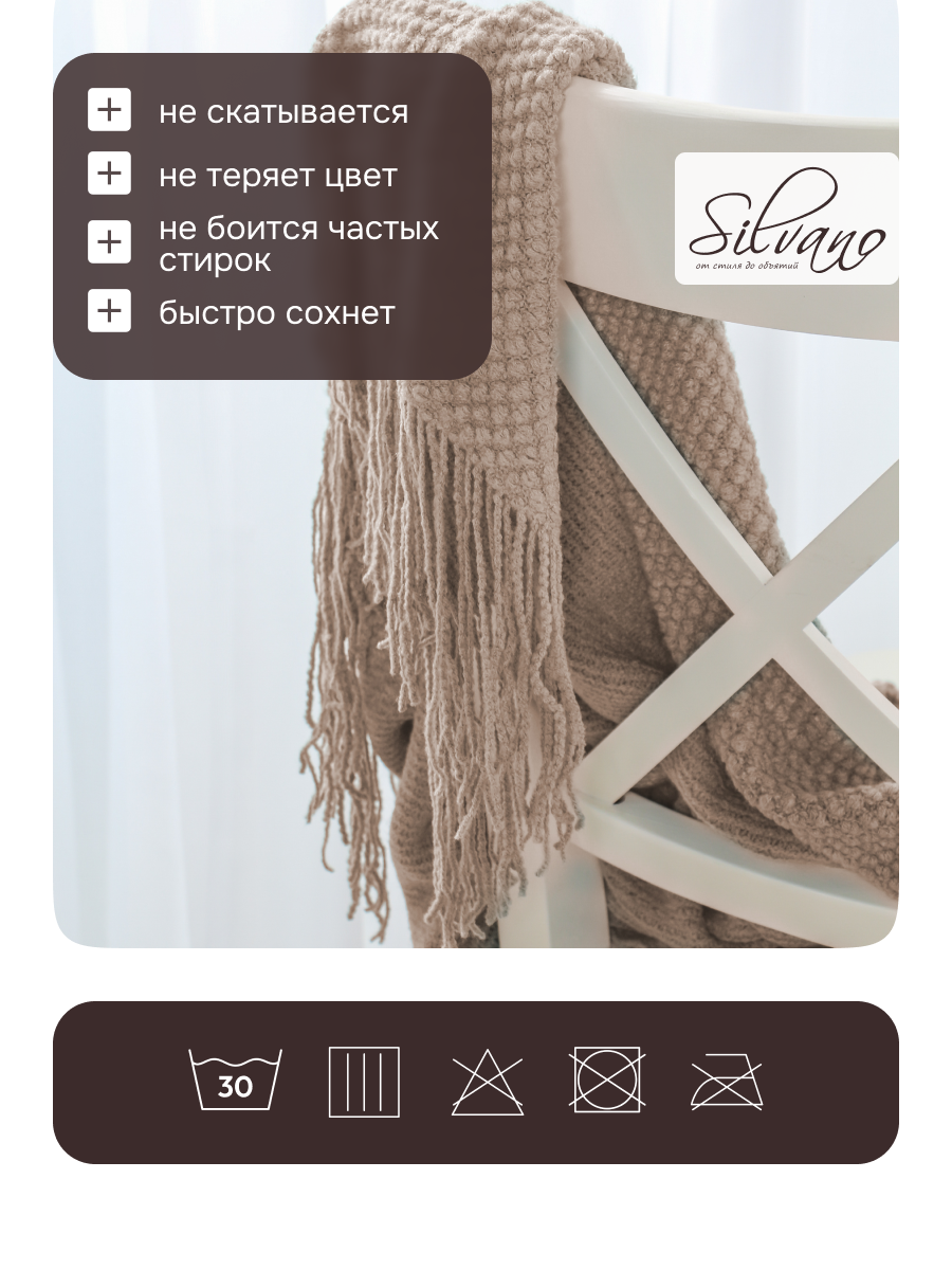 Плед Silvano «Теплые объятия» — это идеальное решение для тех, кто ищет, какой плед выбрать для дома, дачи или в подарок. Однотонный бежевый цвет гармонично вписывается в любой интерьер, а вязаная текстура создает ощущение уюта и защищенности. Благодаря составу из 100% полиэстера, плед легко стирается при 30–40°C, быстро сохнет и сохраняет форму даже при частом использовании.