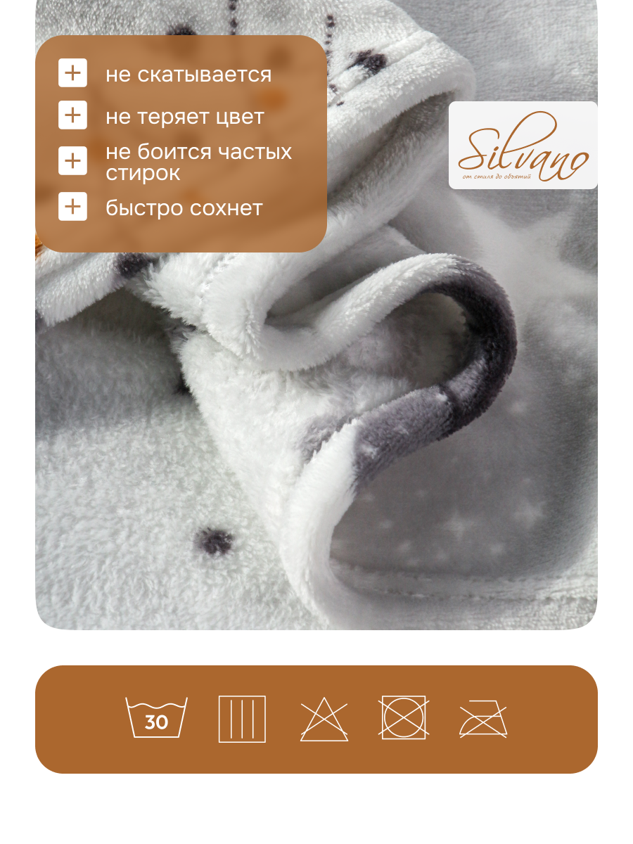 Рекомендуется машинная стирка при 40°C без отбеливателей, быстрая сушка, плед не требует глажки и сохраняет мягкость даже после многократных стирок.