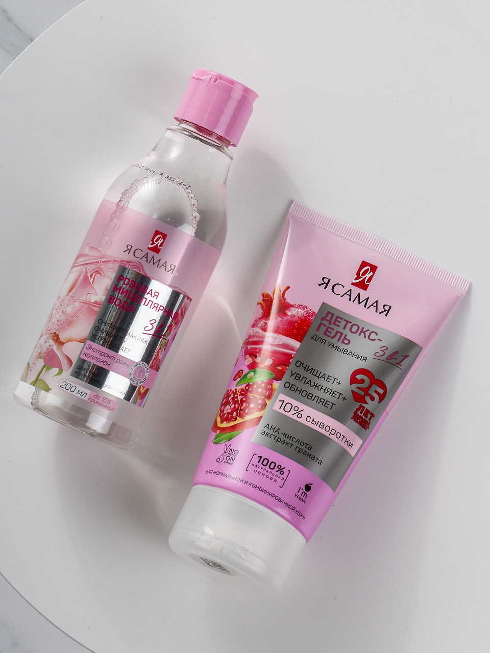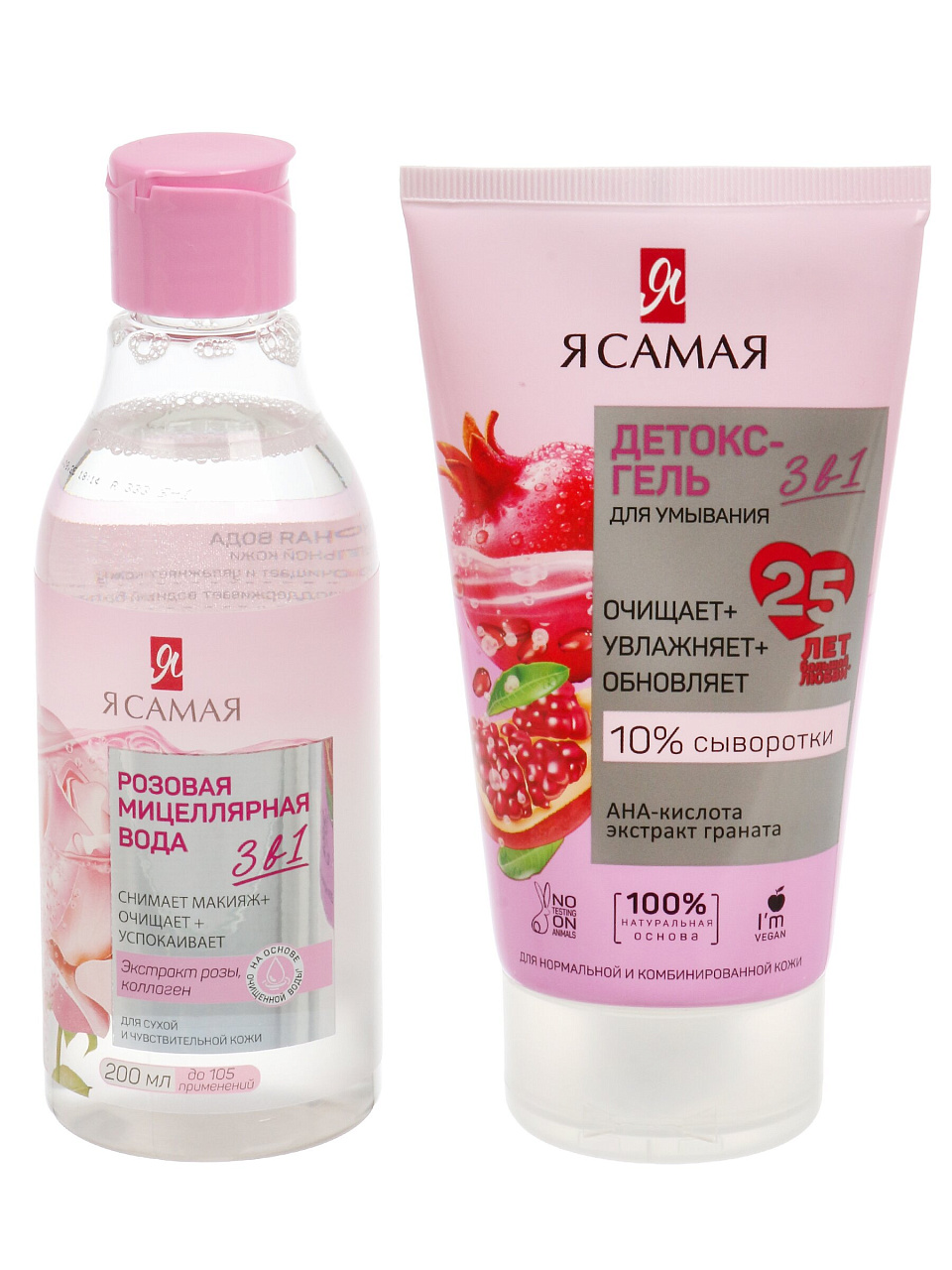 Набор «Я самая» сочетает мицеллярную воду и детокс-гель для умывания — это эффективное средство для ежедневного очищения и поддержания баланса кожи. Комплекс мягко удаляет макияж, загрязнения и излишки себума, не пересушивая кожу. Благодаря современным технологиям, формулы подходят для всех типов кожи, включая чувствительную, и не содержат агрессивных компонентов.