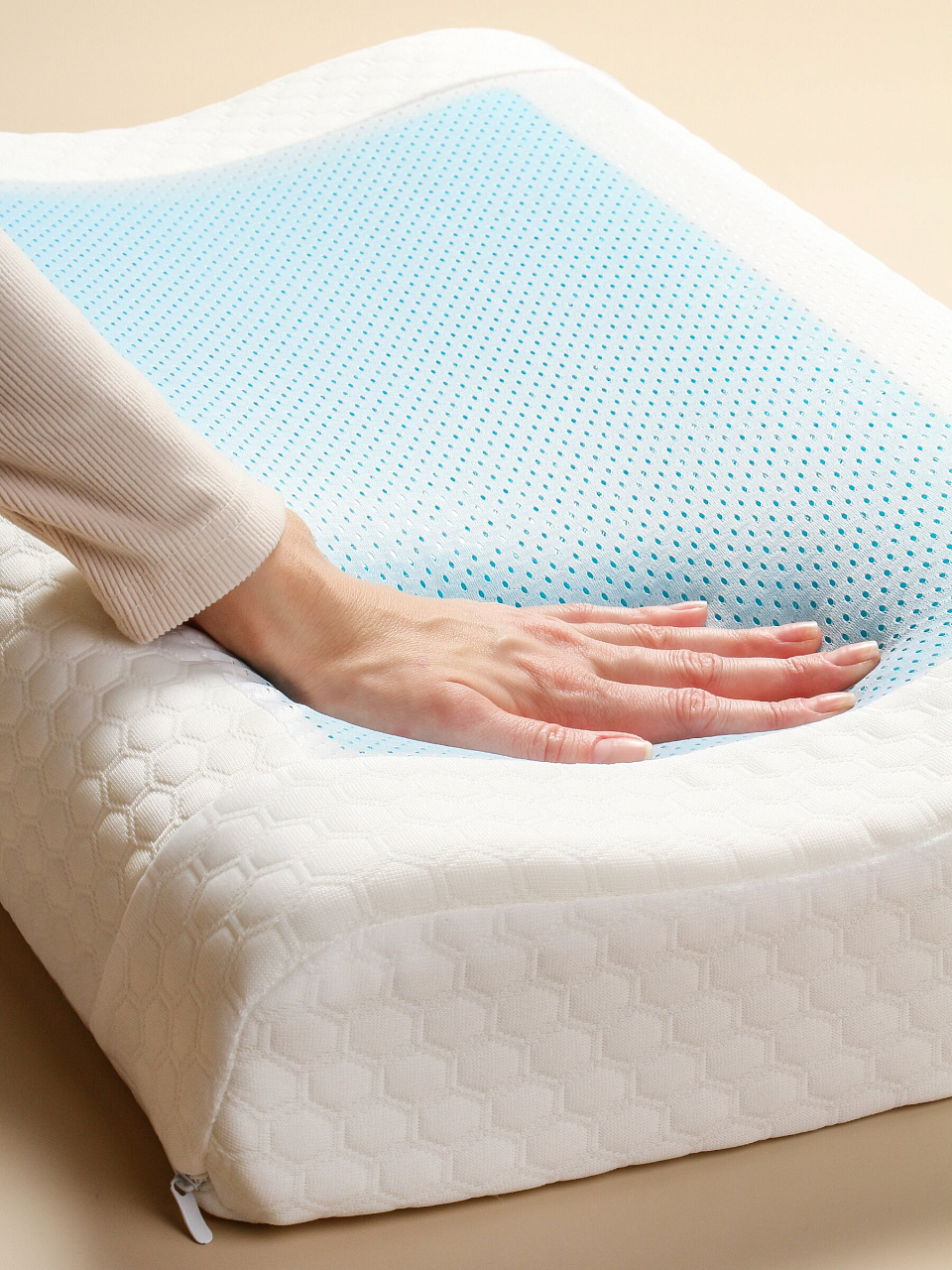 Материал с памятью формы снижает давление на шею, поддерживает позвоночник, предотвращает боли и улучшает качество сна.
