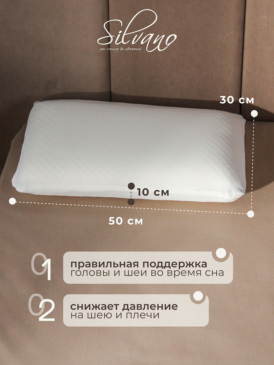 Ортопедическая подушка Silvano 50×30×10 см с эффектом памяти: крепкий сон без боли в шее, жёсткая поддержка, чехол 100% полиэстер, наволочка в комплекте.