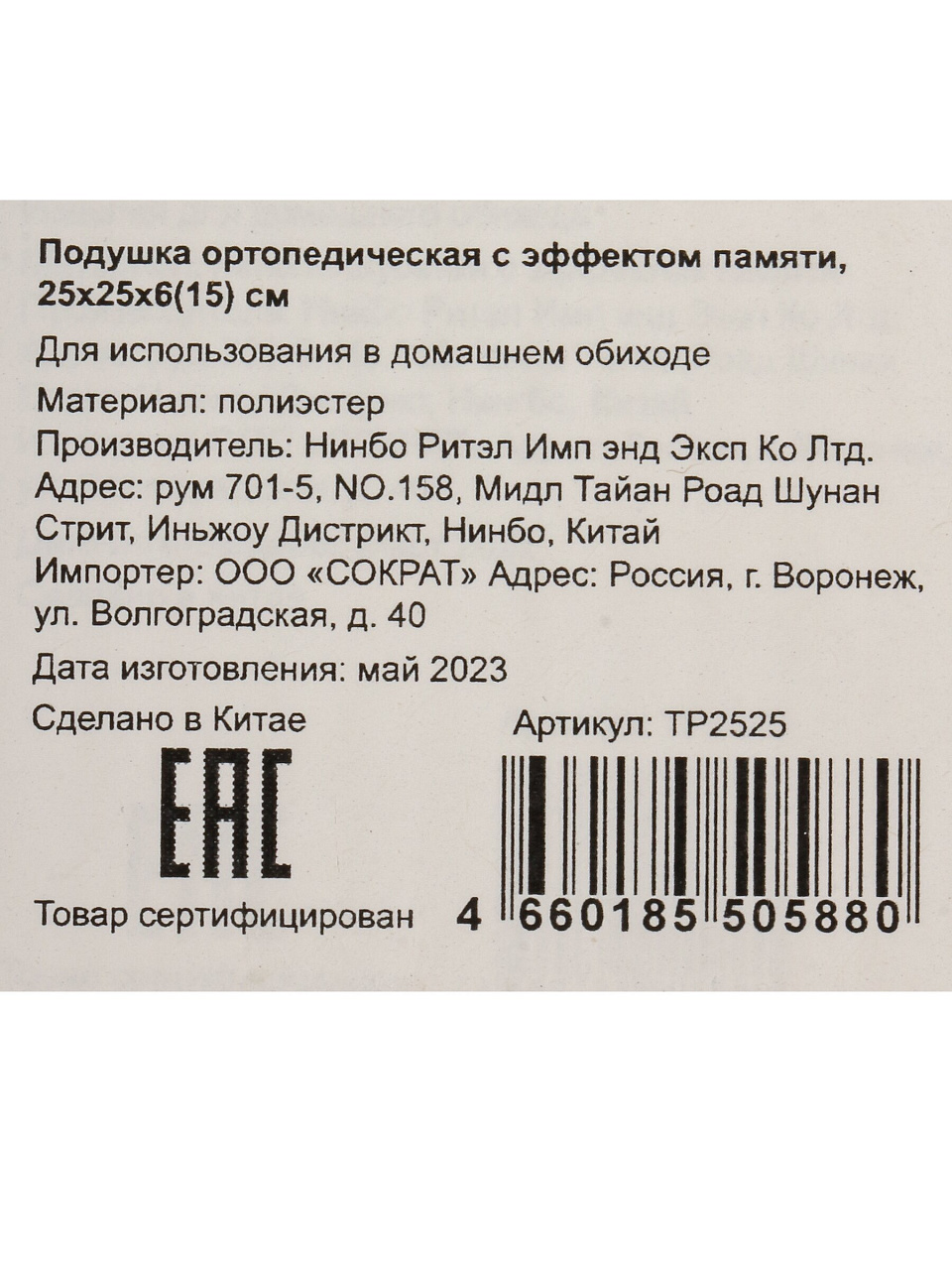 Вы можете приобрести «Подушка ортопедическая, 25х25х6(15) см, чехол полиэстер, с эффектом памяти, средняя, для ног, TP2525» и другие товары в нашем интернет-магазине в Железногорске по низким ценам и с бесплатным самовывозом.