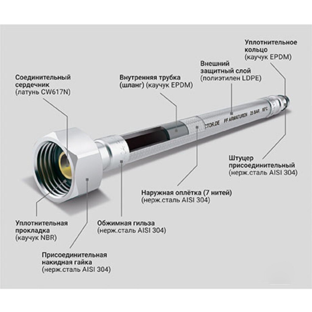 - материал оплетки — нержавеющая сталь с полимерным покрытием для максимальной защиты от коррозии и повреждений;