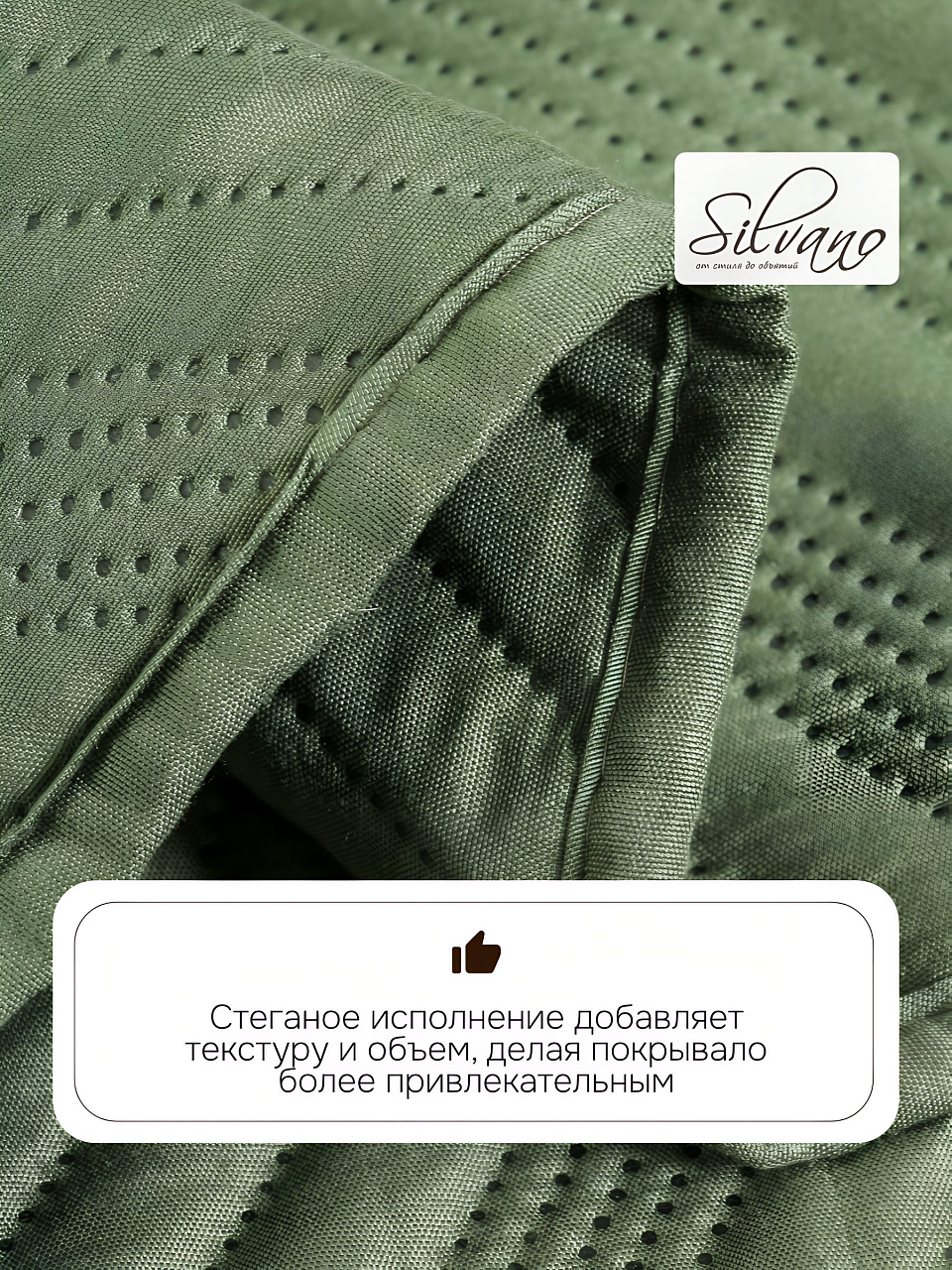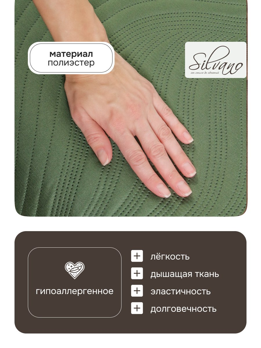 Покрывало Silvano Модерн 220х240 см — это идеальный выбор для тех, кто ищет недорогое, но стильное покрытие для кровати или дивана. Благодаря прочному полиэстеру покрывало не теряет форму после стирки, не выцветает и не скатывается, что особенно важно для ежедневного использования. Стеганая структура обеспечивает дополнительную плотность и приятную тактильность, а современный темно-зеленый цвет гармонирует с разными стилями интерьера — от минимализма до лофта.