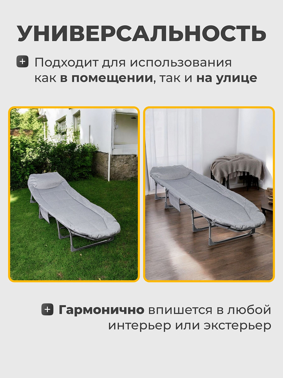 Покупка этой раскладушки — это выгодное вложение в комфорт и качество отдыха. Она станет отличным выбором для тех, кто ценит надежность и удобство в сочетании с современным дизайном. Независимо от того, где она будет использоваться — дома или на природе — раскладушка обеспечит комфортный сон и отдых, позволяя вам наслаждаться каждым моментом. Преимущества этой модели очевидны: она не только практична и функциональна, но и доступна по цене, что делает ее идеальным выбором для каждого, кто стремится создать уютное пространство для отдыха.
