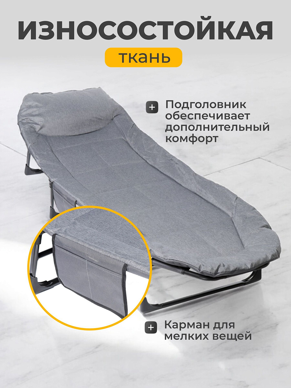 Раскладушка оснащена подголовником, что обеспечивает дополнительное удобство для головы и шеи, способствуя полноценному отдыху. Компактные размеры в сложенном виде позволяют легко транспортировать и хранить ее, что делает этот товар незаменимым спутником для путешествий и выездов на природу.