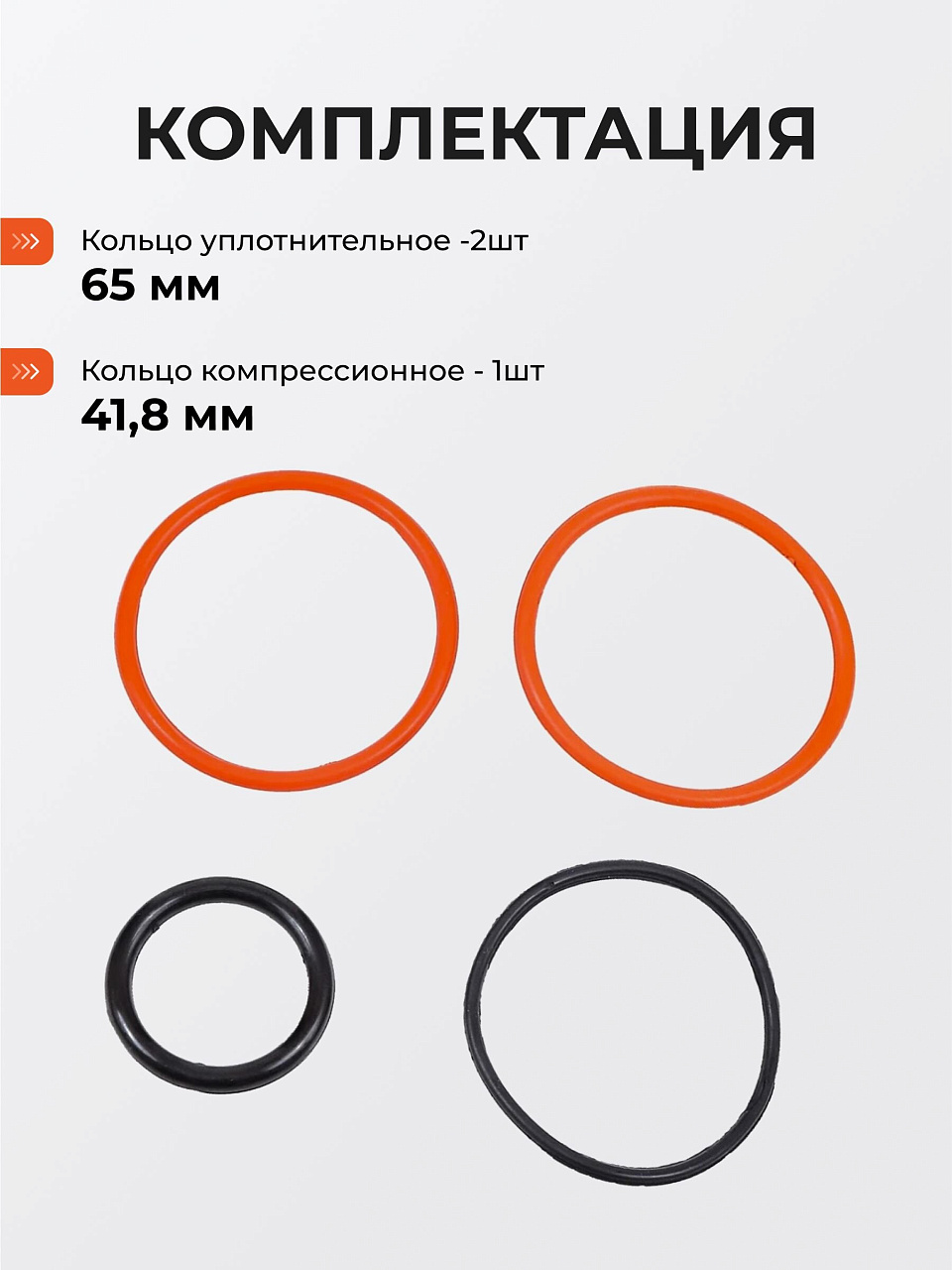 Комплектация: кольцо уплотнительное (диаметр 65 мм) 2 шт, кольцо компрессионное (диаметр 41.8 мм) 1 шт, клапан насоса,завихритель.