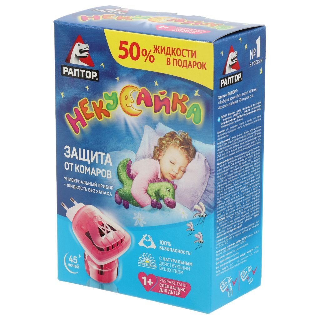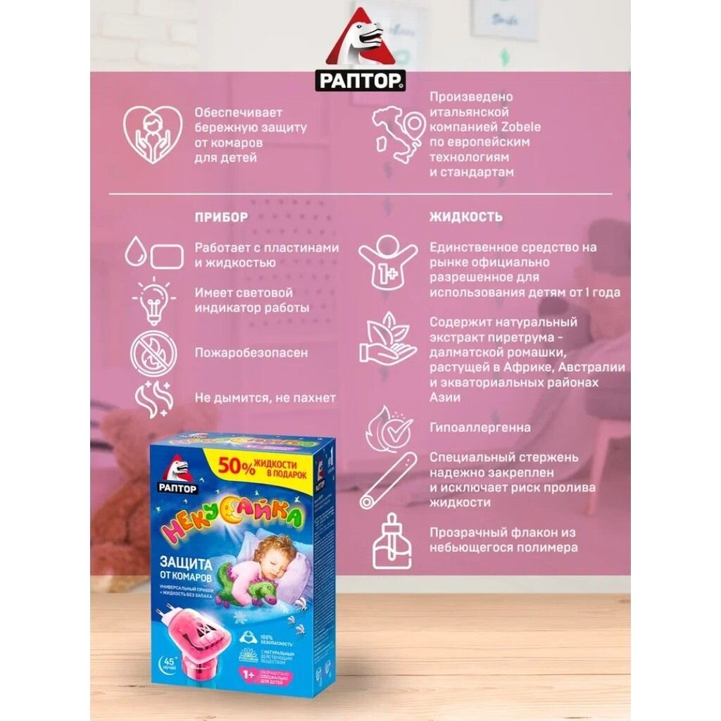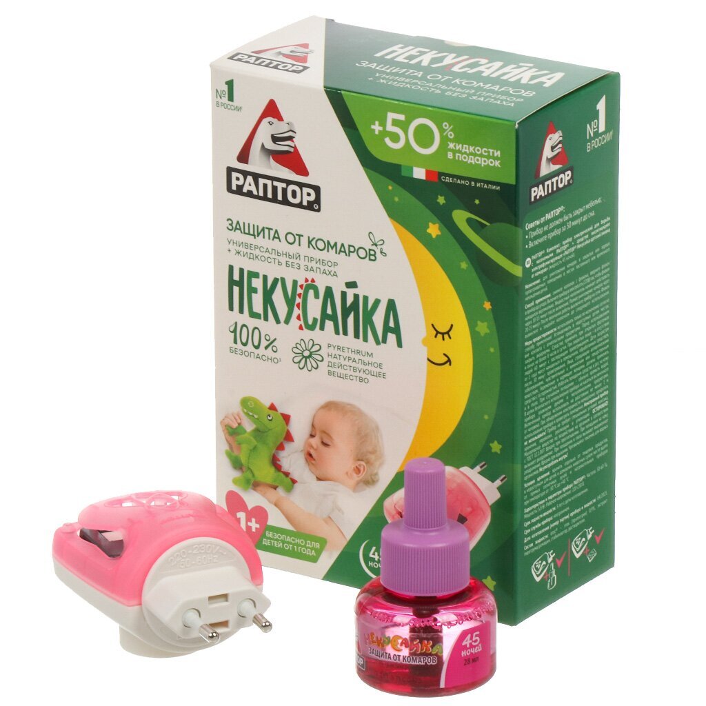 Репеллент от комаров Раптор Некусайка — эффективная защита для детей в помещении на 45 ночей. Фумигатор с жидкостью подходит для уничтожения комаров, не имеет запаха и безопасен для малышей. Надежное средство для спокойного сна и комфорта в доме или на даче.