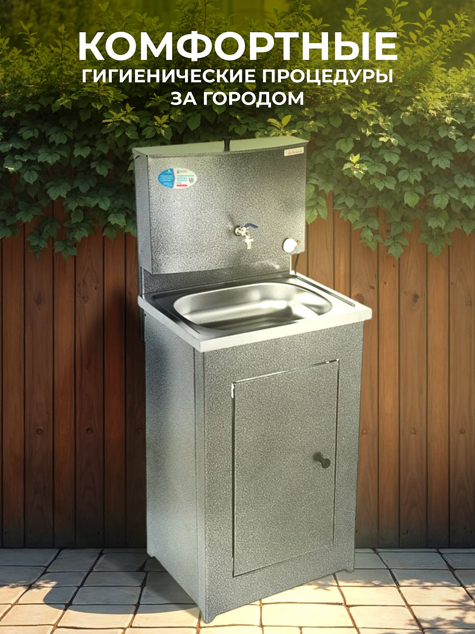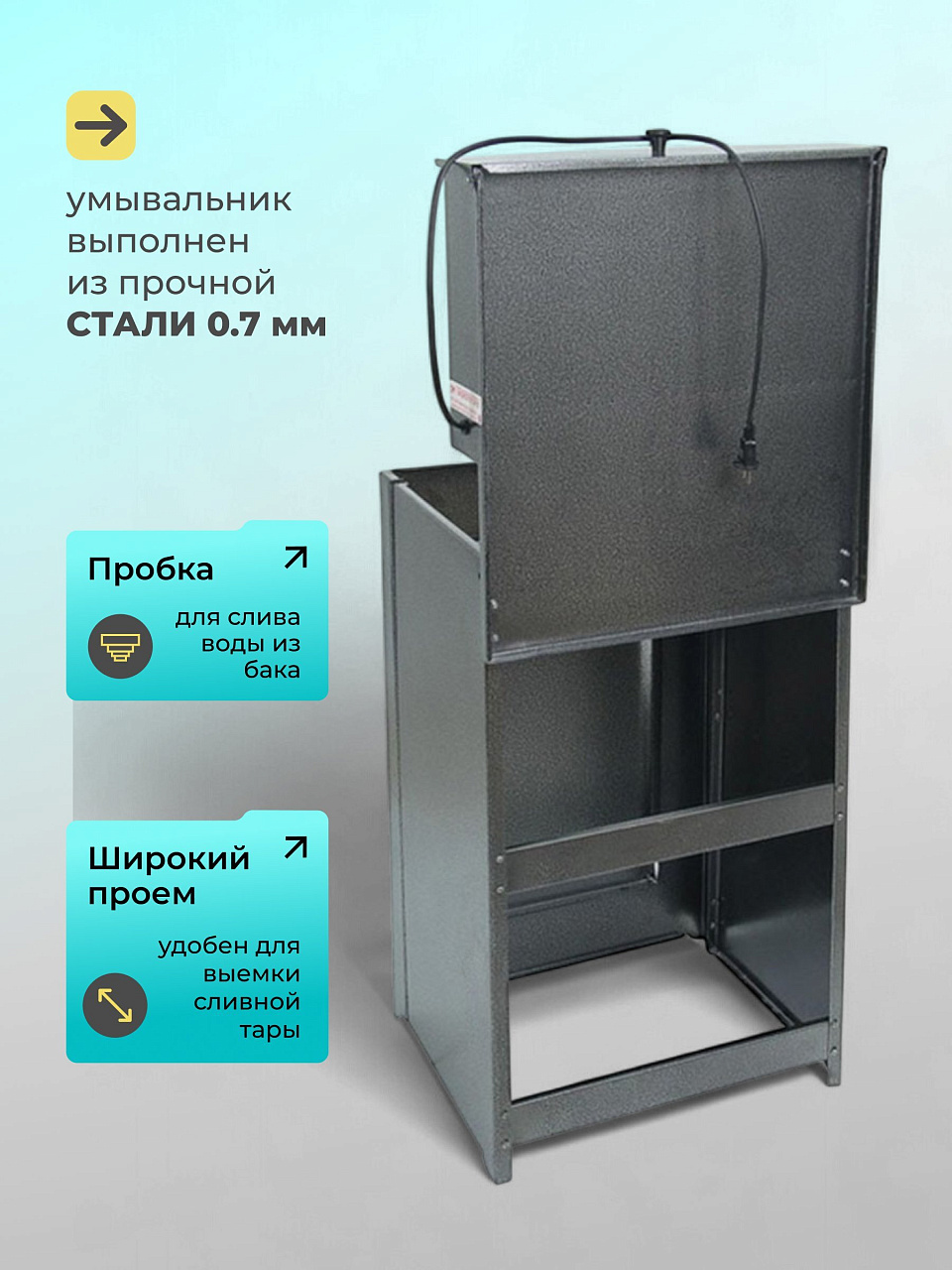 Конструкция умывальника сборная, состоит из бака с металлическим шаровым краном и тумбы, которая незаметно скрывает способ отлива воды и позволяет монтировать отвод воды как в закрытую емкость, так и в канализацию. Бак внутри обработан запатентованным противокоррозийным покрытием, которое гарантирует долговечность продукции и исключает возникновение ржавчины.