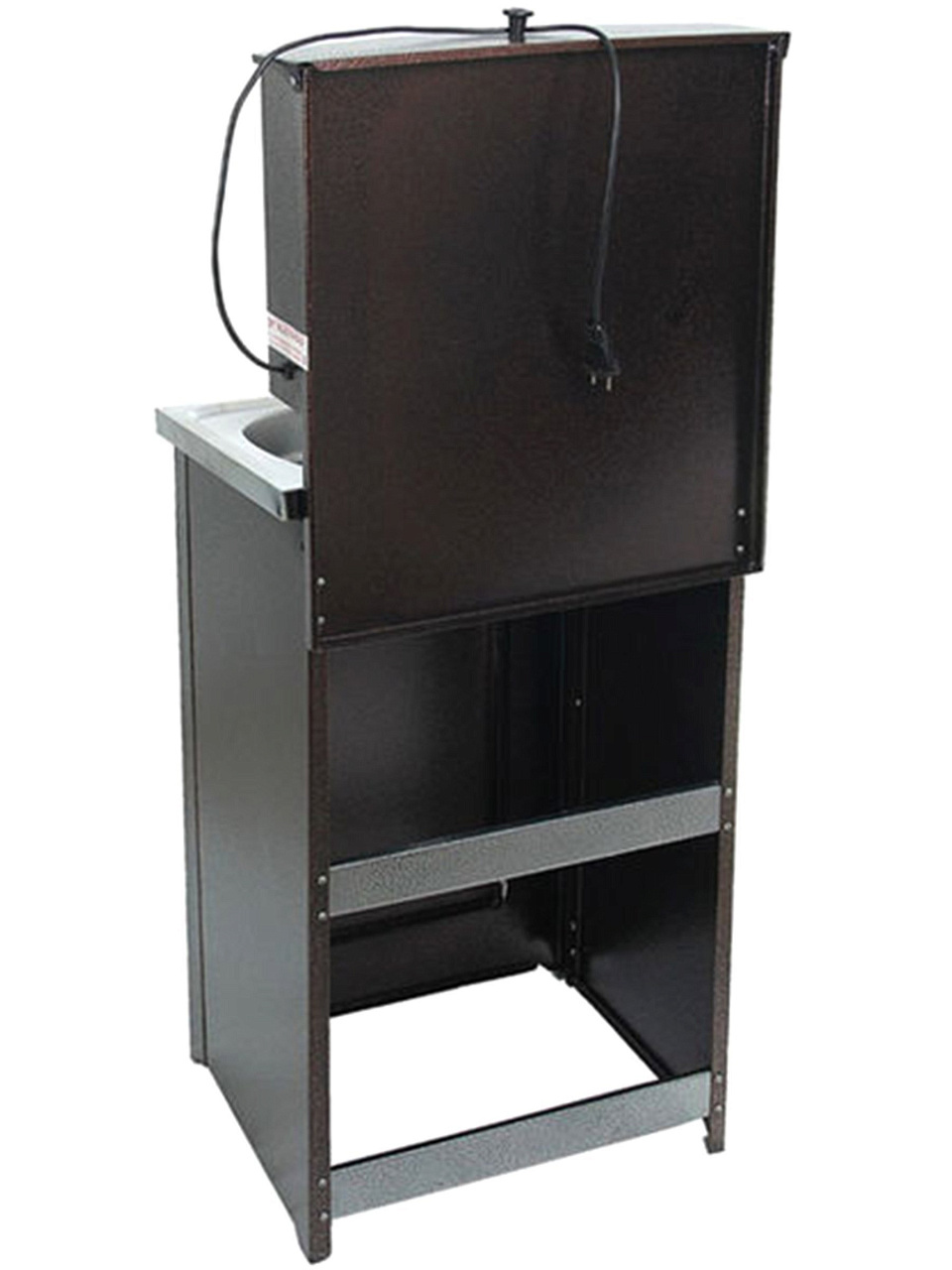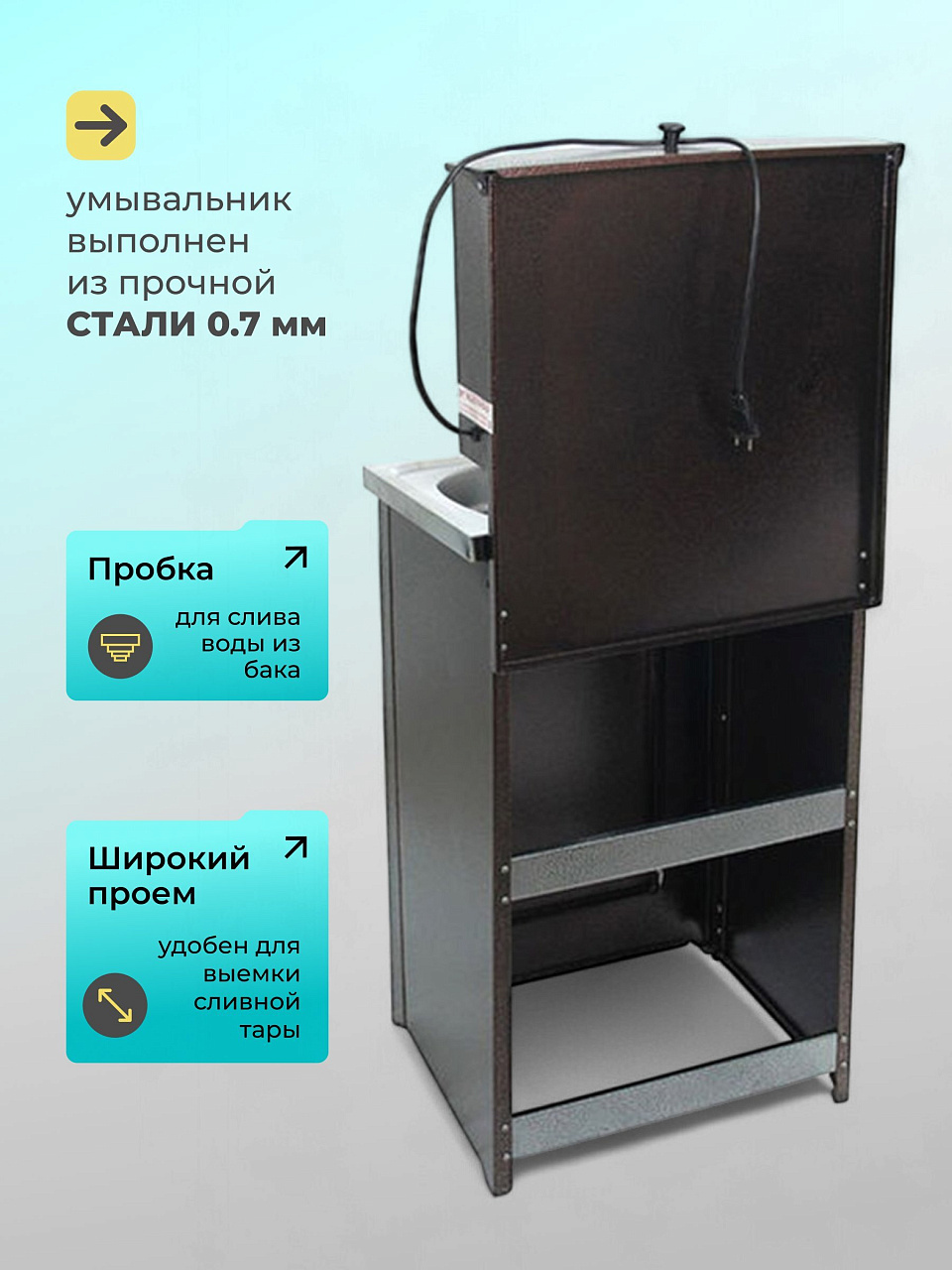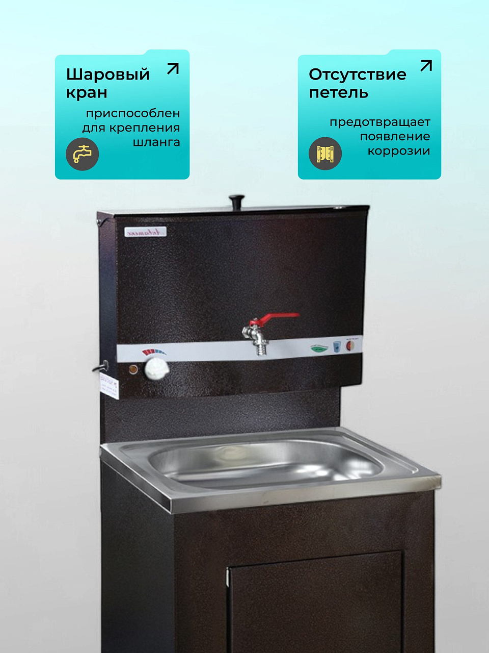 Конструкция умывальника сборная, состоит из бака с металлическим шаровым краном и тумбы (дверь не на магните), которая незаметно скрывает способ отлива воды и позволяет монтировать отвод воды как в закрытую емкость, так и в канализацию. Умывальник выполнен из высококачественной стали 0.7 мм, окрашен прочной краской. Бак внутри обработан запатентованным противокоррозийным покрытием, которое гарантирует долговечность продукции и исключает возникновение ржавчины.