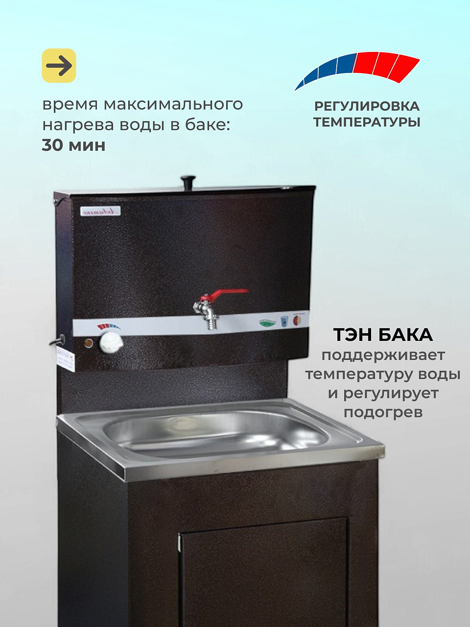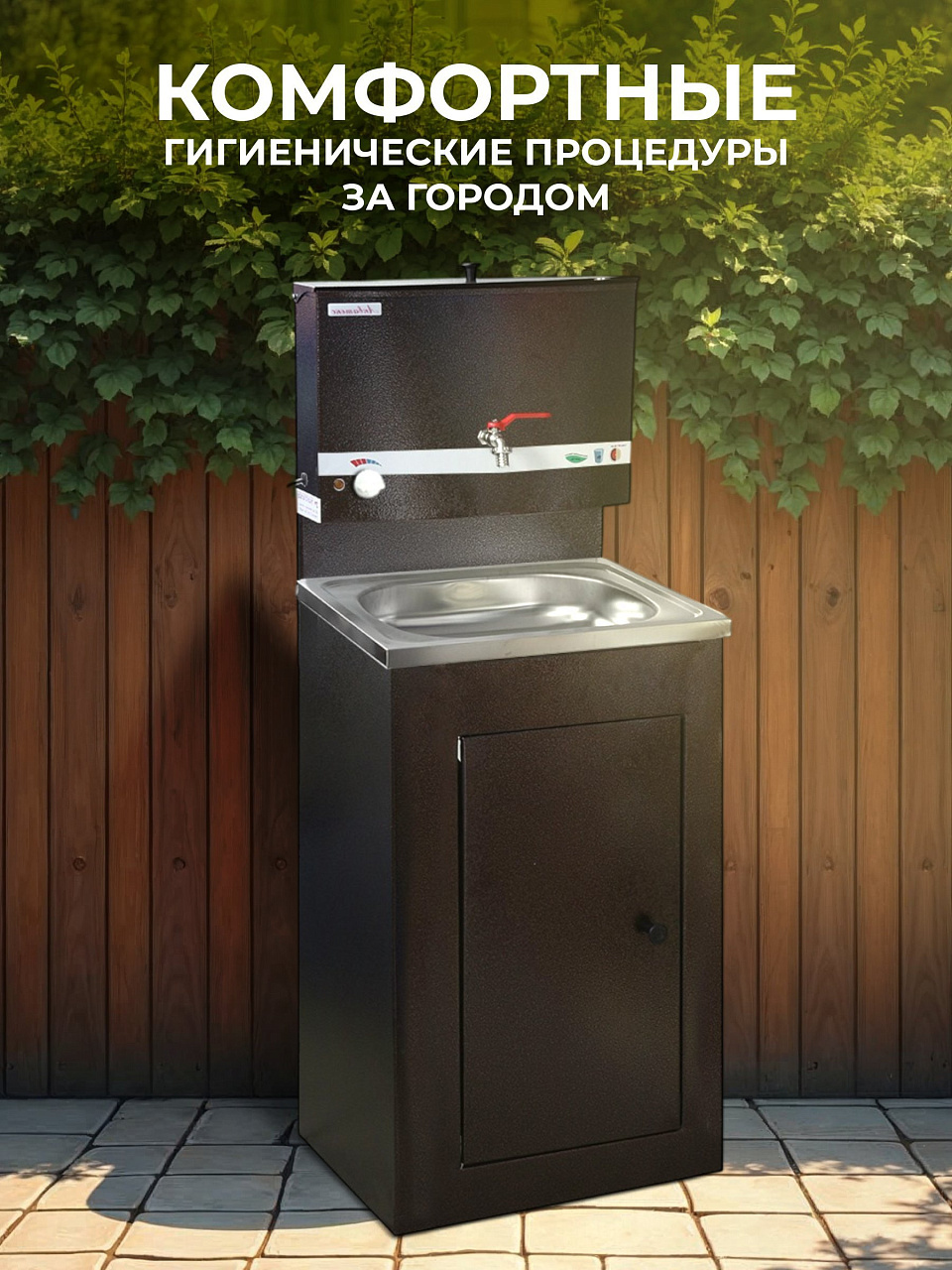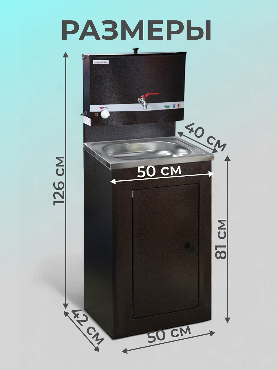 Конструкция умывальника сборная, состоит из бака с металлическим шаровым краном и тумбы (дверь не на магните), которая незаметно скрывает способ отлива воды и позволяет монтировать отвод воды как в закрытую емкость, так и в канализацию. Умывальник выполнен из высококачественной стали 0.7 мм, окрашен прочной краской. Бак внутри обработан запатентованным противокоррозийным покрытием, которое гарантирует долговечность продукции и исключает возникновение ржавчины.