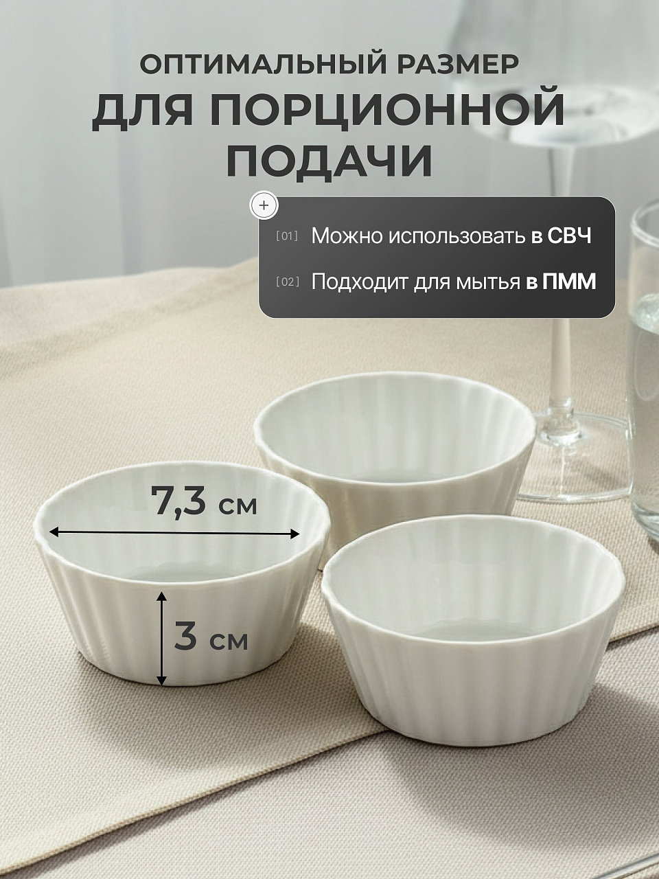 Каждый салатник имеет диаметр 7,3 см и высоту 3 см. Компактные размеры делают их идеальными для порционных блюд, соусов или десертов.
