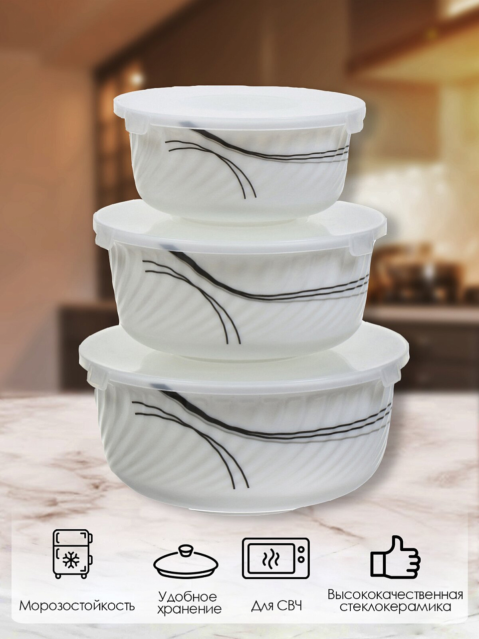 В отличие от пластиковых и металлических аналогов, стеклокерамика не впитывает запахи, устойчива к перепадам температуры и не выделяет вредных веществ при нагревании. Если вы ищете, какой салатник выбрать для микроволновки или как организовать хранение без пересыпания в другую посуду — этот набор отвечает всем современным требованиям. Белый цвет и лаконичный скандинавский дизайн с полосой гармонично впишутся в любой интерьер кухни.