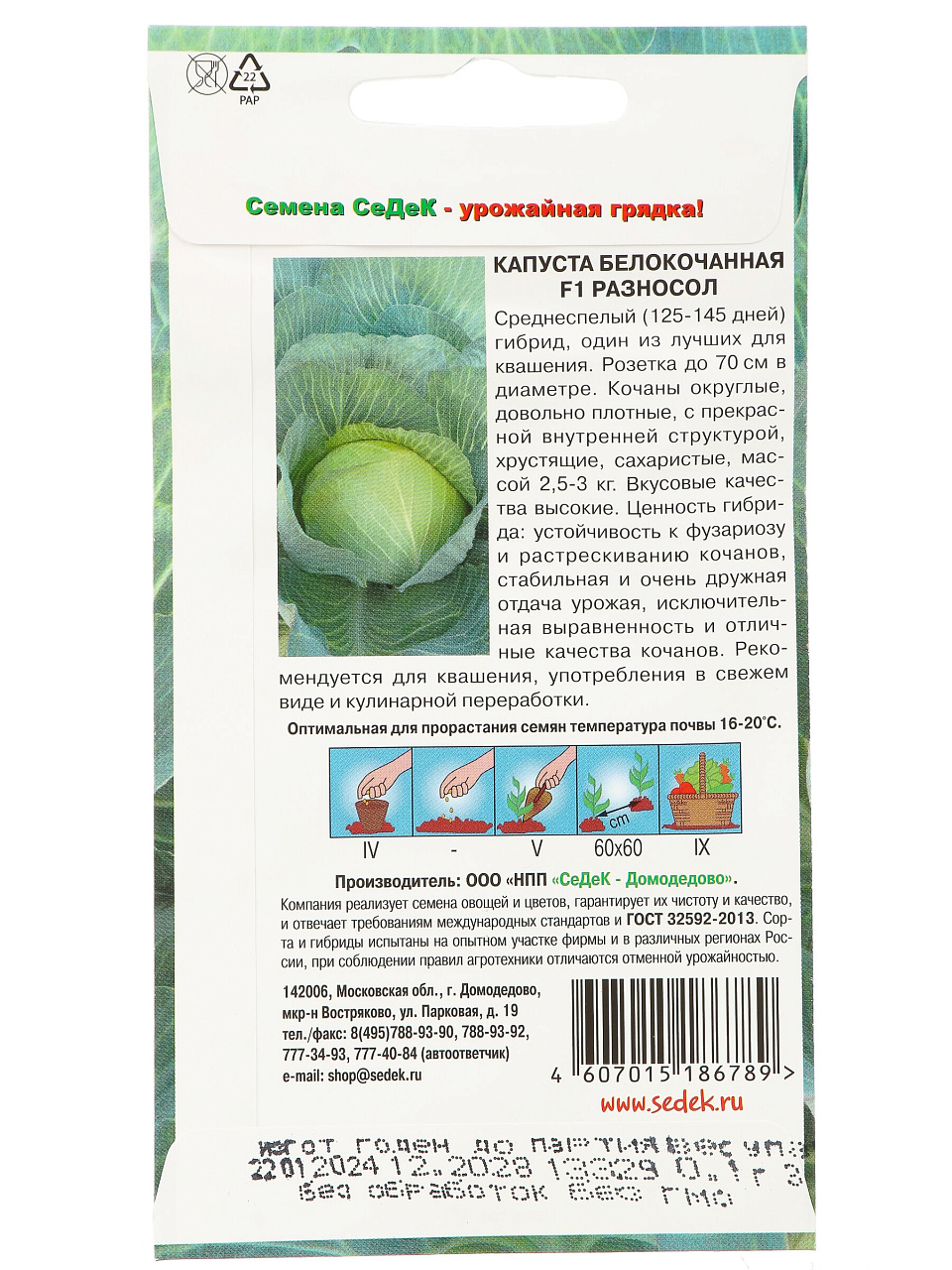 Семена капусты белокочанной Разносол F1 относятся к среднеспелым гибридам: период от всходов до технической спелости составляет 75-78 дней. Упаковка 0.3 г рассчитана на стандартную грядку.