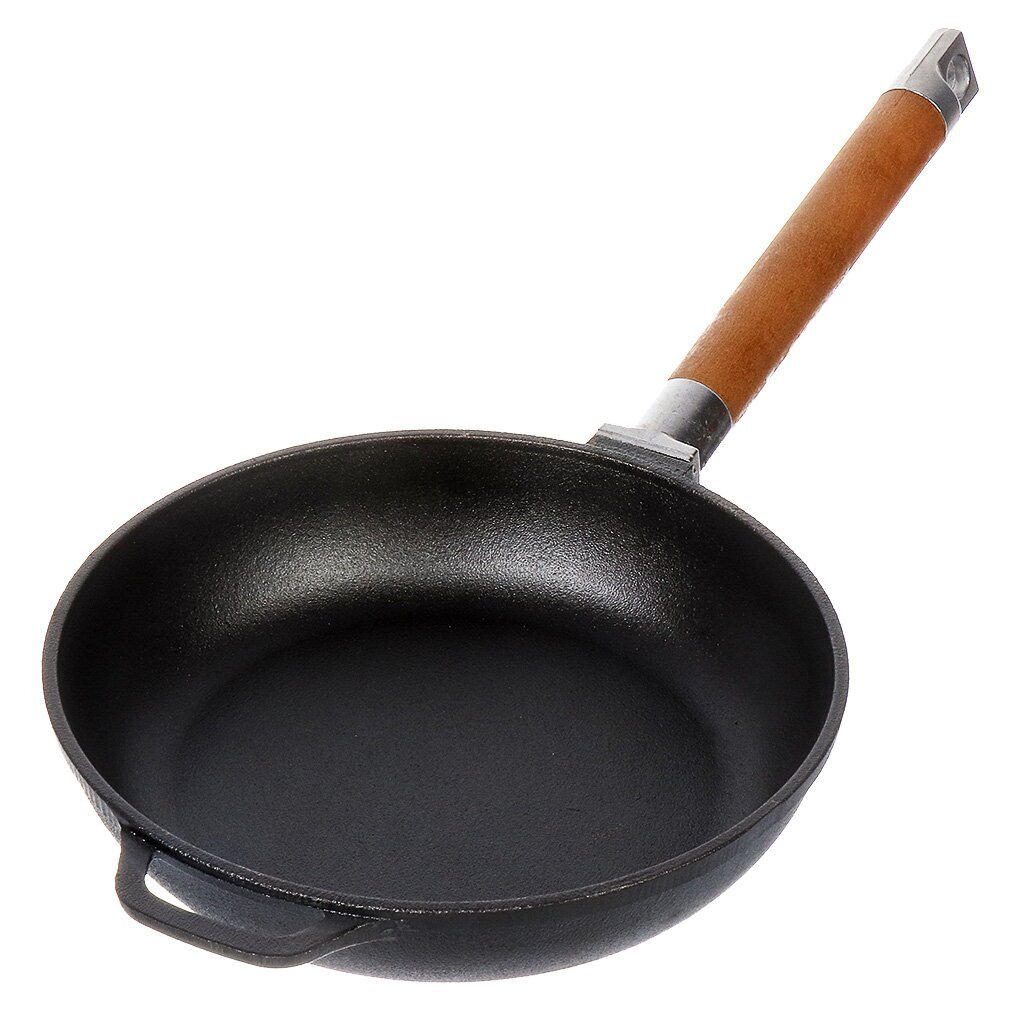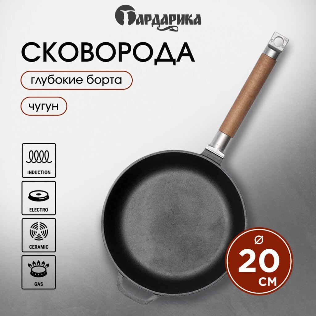 Чугунная сковорода Гардарика 20 см с деревянной съемной ручкой — долговечное решение для индукции и любых плит. Готовьте мясо, рыбу, оладьи без лишних хлопот!