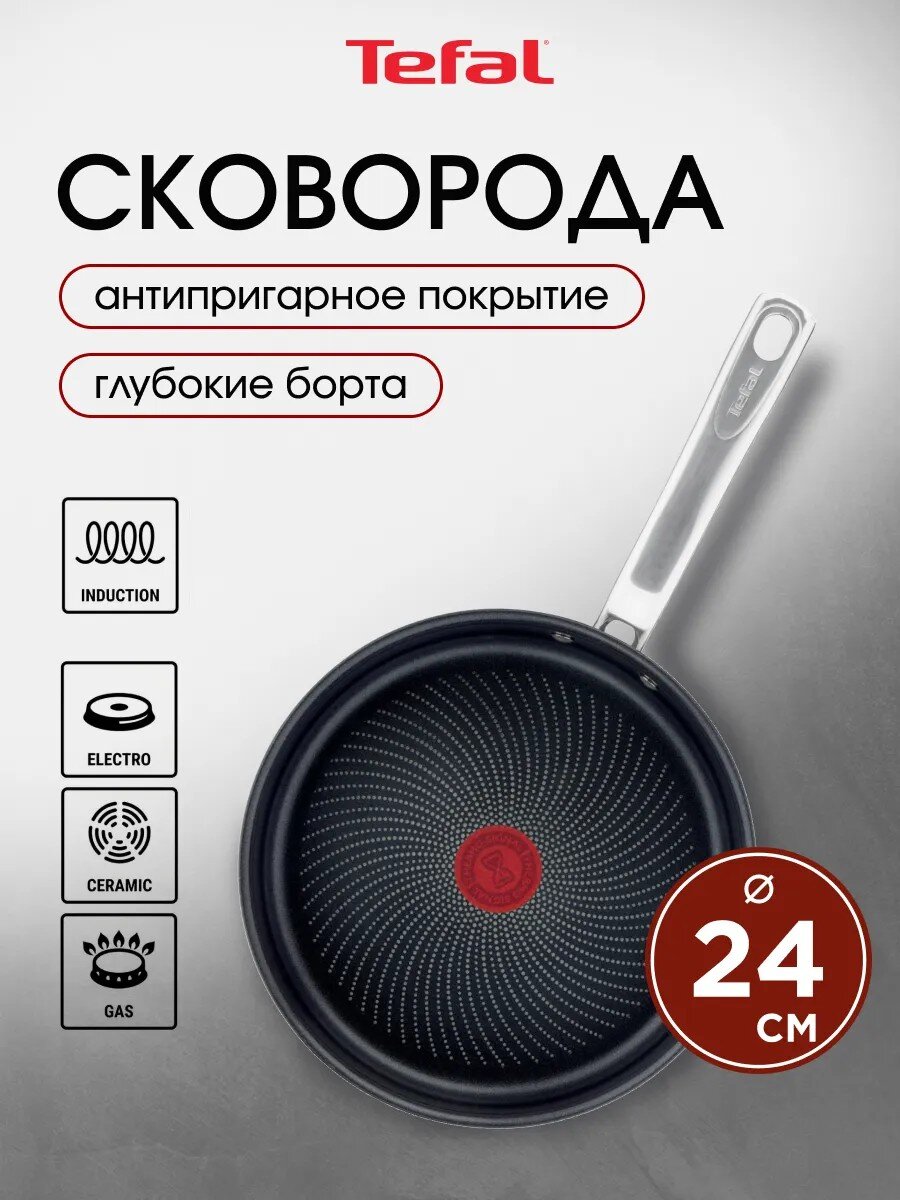 Сковорода Tefal Intuition 24 см из нержавеющей стали с титановым антипригарным покрытием: идеальный выбор для индукции, долгая служба, легкий уход, выгодно для дома и дачи.