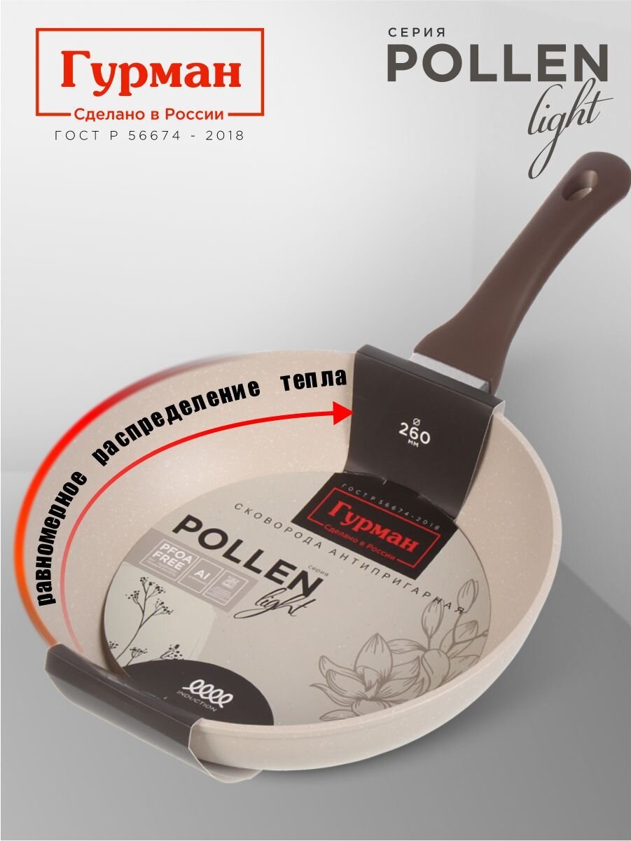 Вы можете приобрести «Сковорода литой алюминий, 26 см, антипригарное покрытие, Гурман, Pollen light, индукция, ГМ2601ПЛИ» и другие товары в нашем интернет-магазине в Ельце по низким ценам и с бесплатным самовывозом.