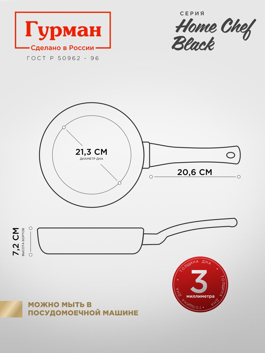Если вы ищете, какую сковороду выбрать для индукционной плиты или газовой, модель Гурман HomeChef Black — оптимальный вариант для ежедневного использования. Лёгкий алюминий быстро нагревается и обеспечивает равномерное приготовление, а современное антипригарное покрытие PFLUON позволяет готовить с минимальным количеством масла, что актуально для здорового питания. В отличие от обычных чугунных или дешёвых тонких моделей, эта сковорода не деформируется и сохраняет эстетичный вид даже при частой мойке в посудомоечной машине.