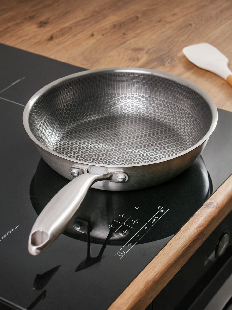 Сковорода из нержавеющей стали 24 см с антипригарным покрытием HouseLoft — универсальное решение для индукции и любых плит. Легко готовьте мясо, рыбу и омлет без прилипания и хлопот.