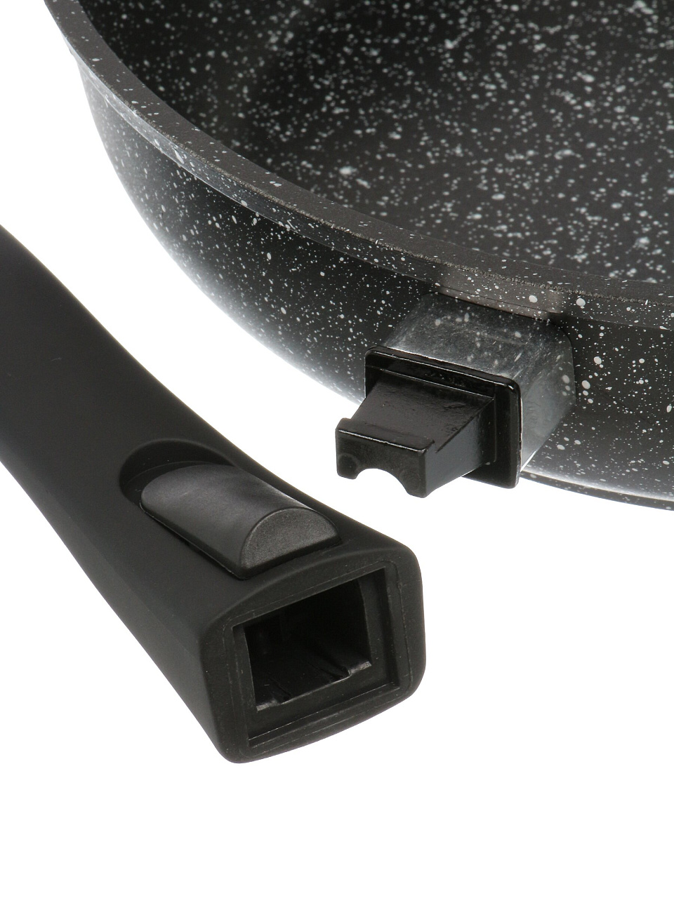 Если вы ищете, какую сковороду выбрать для универсального использования, обратите внимание на глубину борта 60 мм: удобно готовить блюда с соусами, тушить овощи или жарить стейки. Съемная ручка позволяет легко разместить сковороду в духовке или посудомоечной машине, а отсутствие деревянных деталей увеличивает срок службы. В отличие от моделей с классическим тефлоновым покрытием, гранитный слой устойчив к царапинам и не боится металлических лопаток.