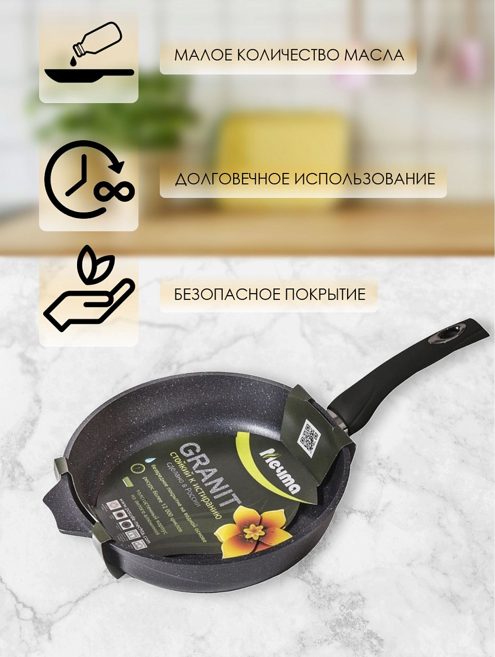 - Гранитное антипригарное покрытие — пища не пригорает, легко моется, подходит для здорового питания