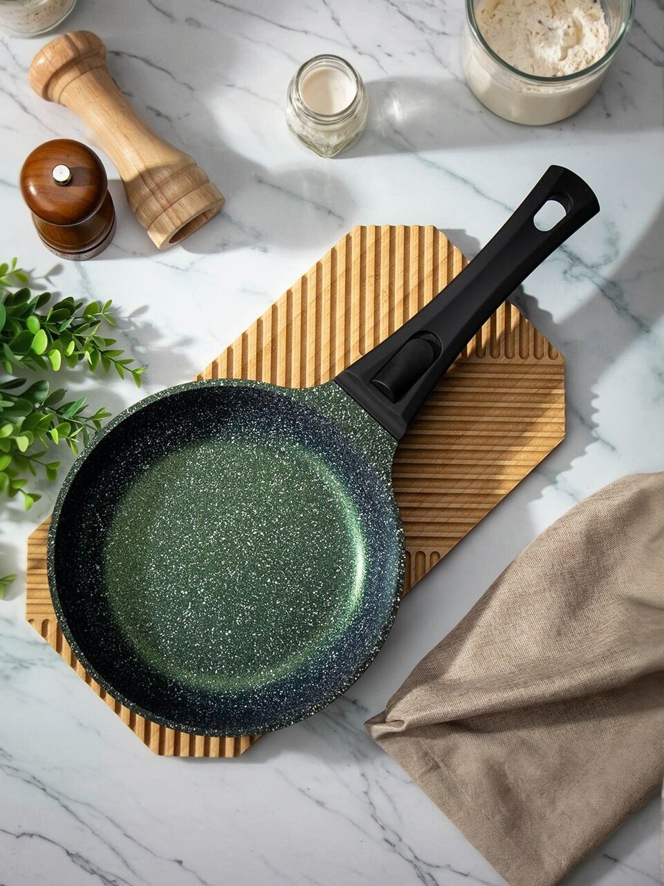 Сковорода 20 см из литого алюминия с мраморным антипригарным покрытием и съемной ручкой: идеальный выбор для здорового и быстрого приготовления дома и на даче.