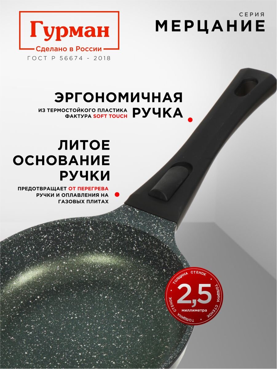 Сковорода «Гурман Мерцание Изумрудный бриллиант» диаметром 20 см — это универсальный выбор для тех, кто ищет, какую сковороду купить недорого для дачи или компактной кухни. Благодаря литому алюминию и мраморному антипригарному покрытию, блюда готовятся без масла, а чистка занимает минимум времени. Съемная ручка делает сковороду удобной для хранения и использования в духовке. Если вы спрашиваете, чем отличается литая алюминиевая сковорода от штампованной — литая прослужит дольше и не деформируется при нагреве.