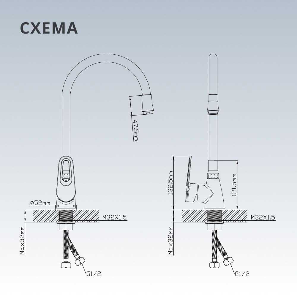Для установки требуется одно отверстие диаметром 45 мм. Смеситель крепится гайкой и подходит для большинства стандартных кухонных моек.