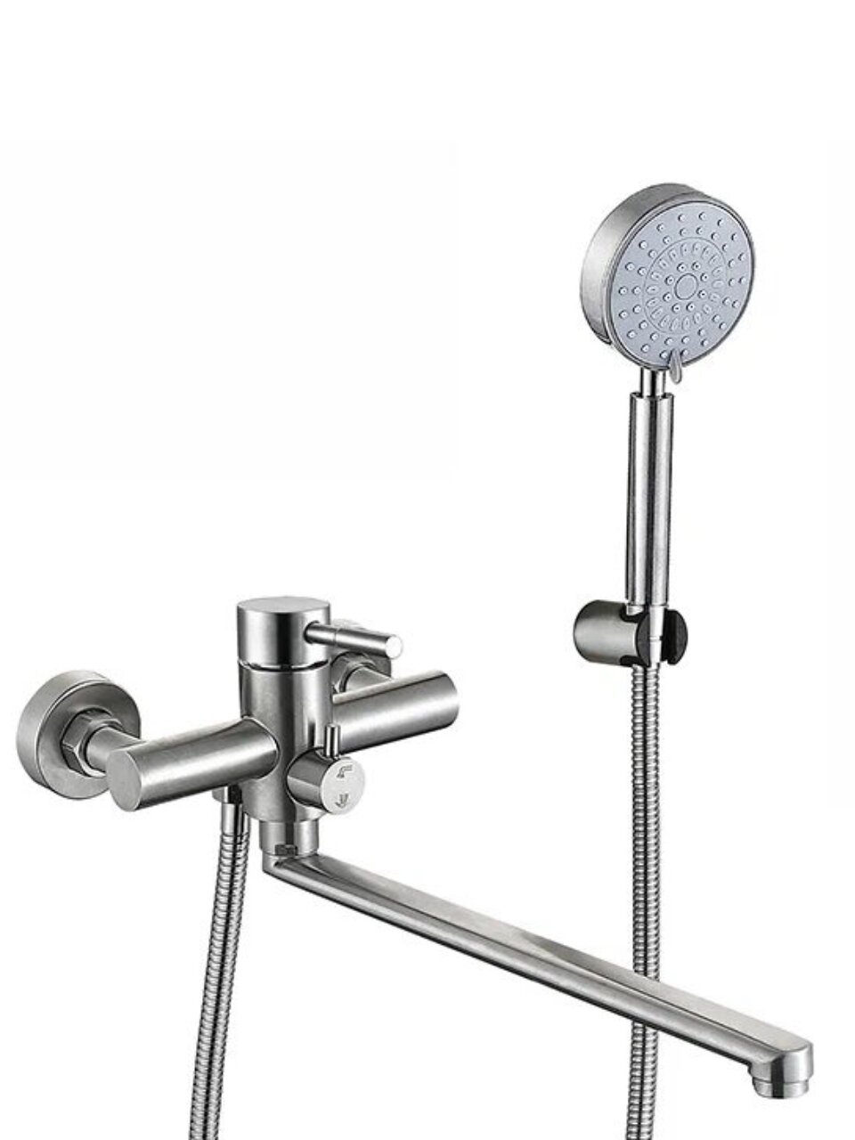 Смеситель для ванны Антей Руда нерж 227010-ANT — долговечный выбор с 3 режимами лейки, длинным изливом 35 см и глянцевой сталью для стильной ванной.