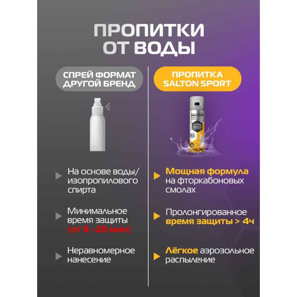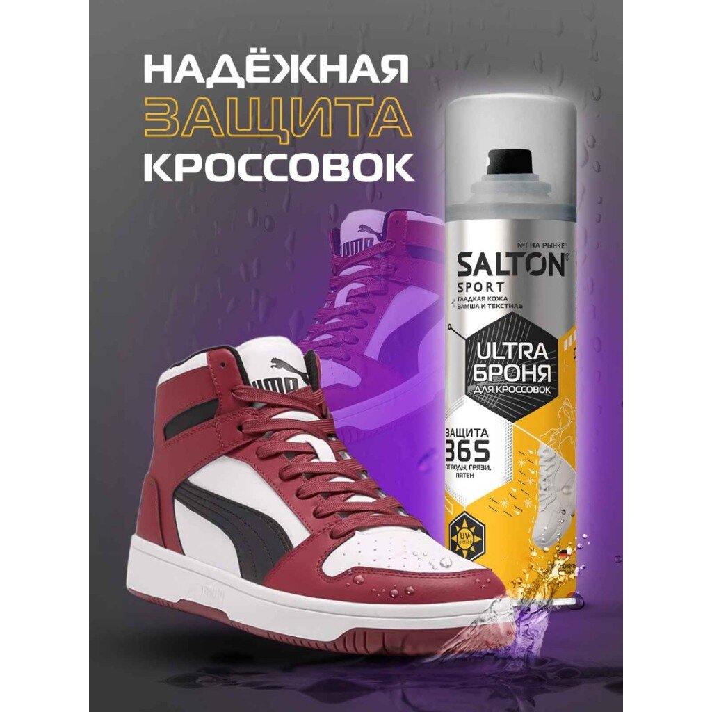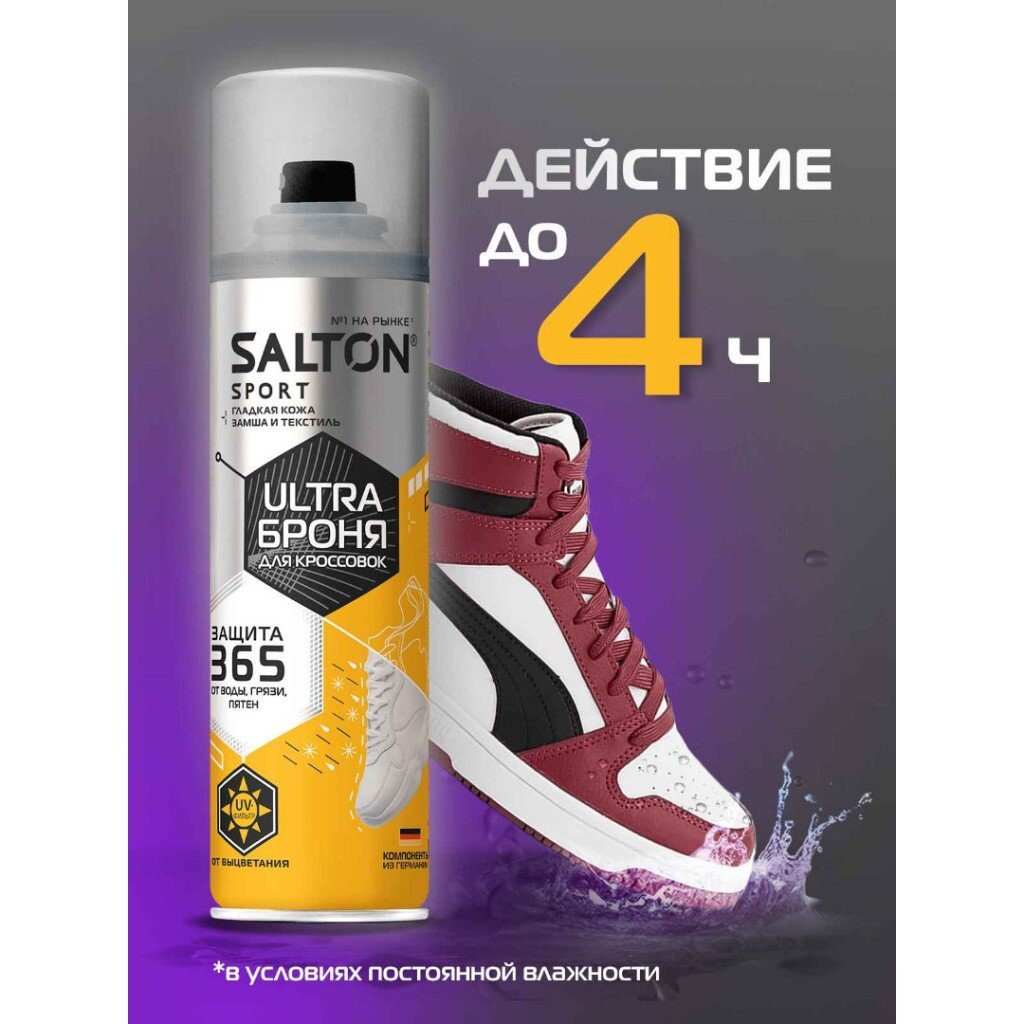 Спрей Salton Sport ULTRA — это современное решение для защиты кроссовок и другой обуви от влаги и загрязнений. Благодаря инновационной формуле, средство подходит для натуральной и искусственной кожи, замши, текстиля. При регулярном применении обувь дольше сохраняет презентабельный вид, а уход за ней становится проще. Если вы ищете, какой спрей лучше выбрать для кроссовок, обратите внимание на Salton Sport ULTRA — он не оставляет следов, не изменяет цвет и структуру материалов.