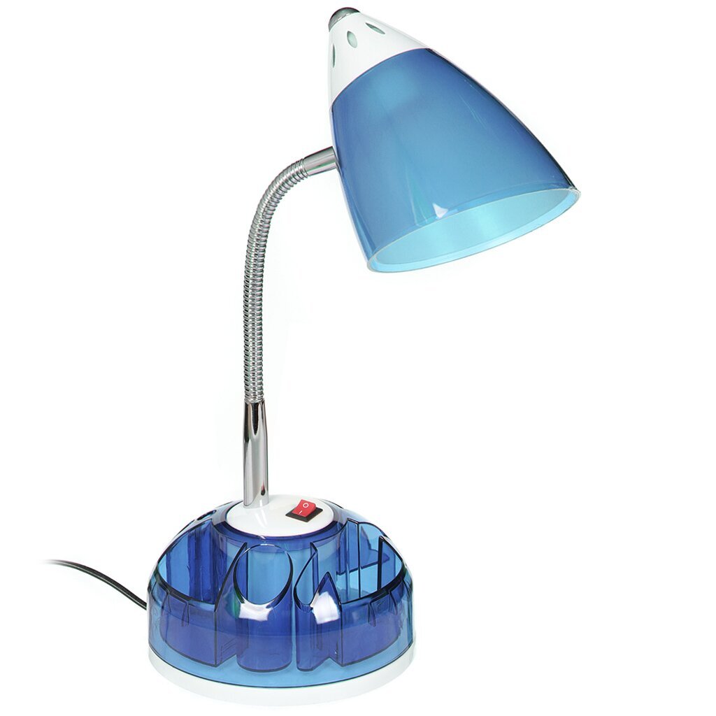Настольный светильник под лампу с цоколем Е27 с пластиковым плафоном удлиненной конусной формы на подставке-пенале. Устойчивая подставка содержит много глубоких ячеек для ручек, канцтоваров или различных мелочей. Оснащен полностью пружинным стволом, который позволяет регулировать угол наклона плафона в любом направлении. Высококачественный керамопластиковый патрон обеспечивает надежный контакт и легкость вкручивания лампы. Регулировка угла освещения осуществляется за счет гофрированного оцинкованного ствола. Предназначен для направленного стабильного освещения рабочей поверхности.