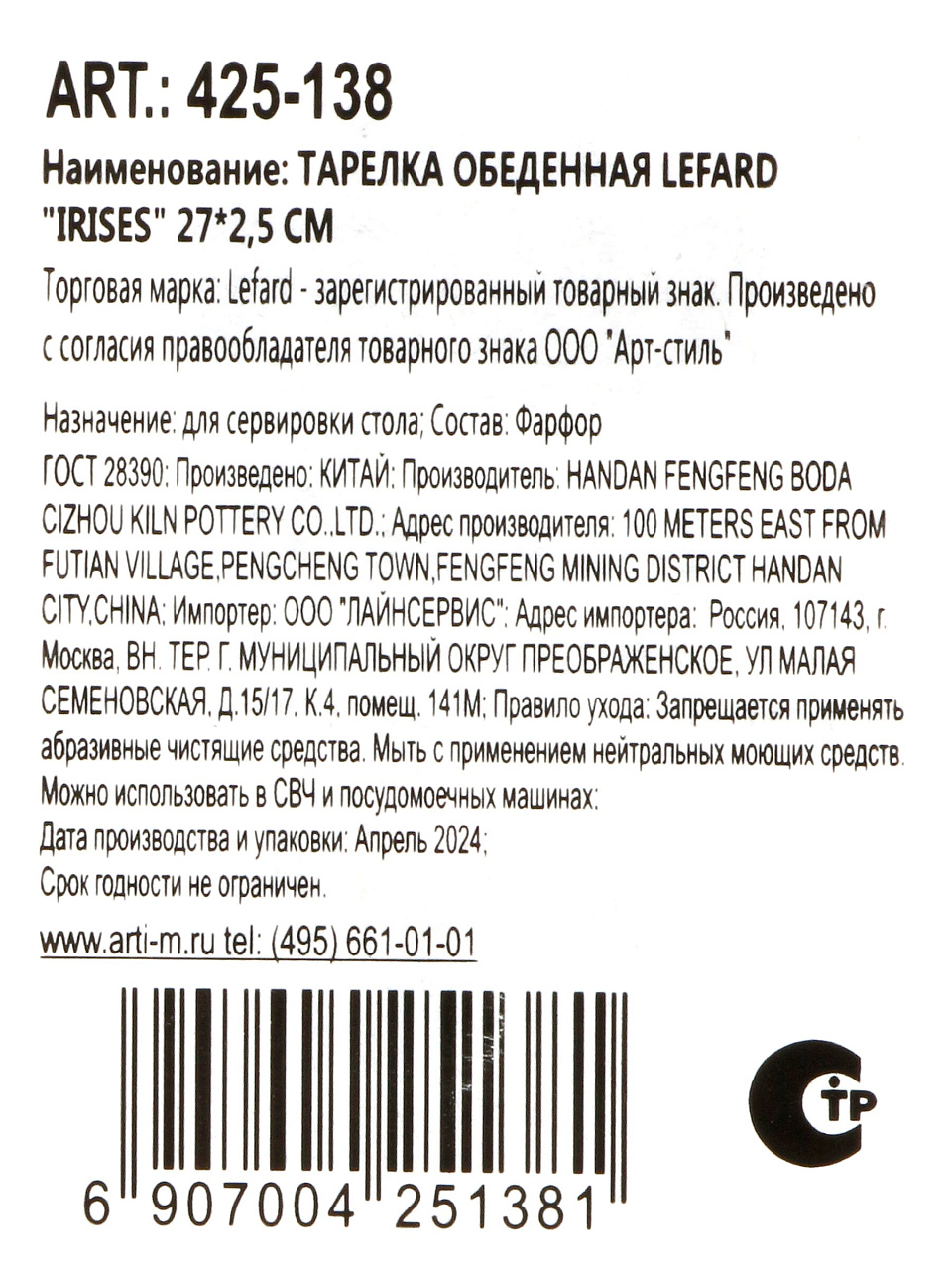 Вы можете приобрести «Тарелка обеденная, фарфор, 27 см, круглая, Irises, Lefard, 425-138» и другие товары в нашем интернет-магазине в Липецке по низким ценам и с бесплатным самовывозом.